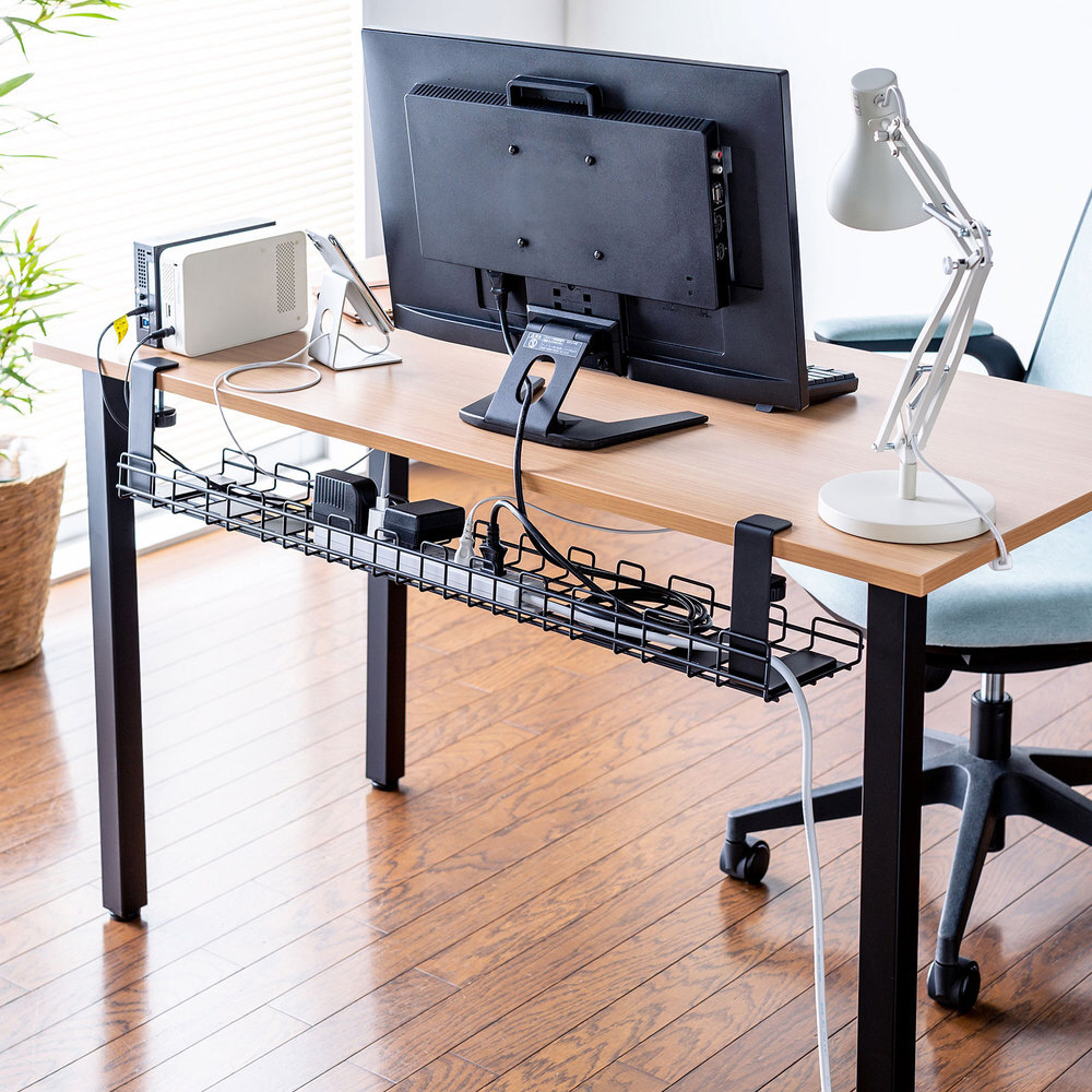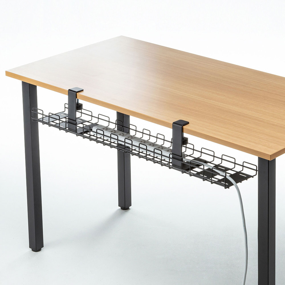 デスクに取り付けて、タップやケーブルなどを収納できるケーブル配線トレー。Lサイズ・ワイヤータイプ・ブラック。