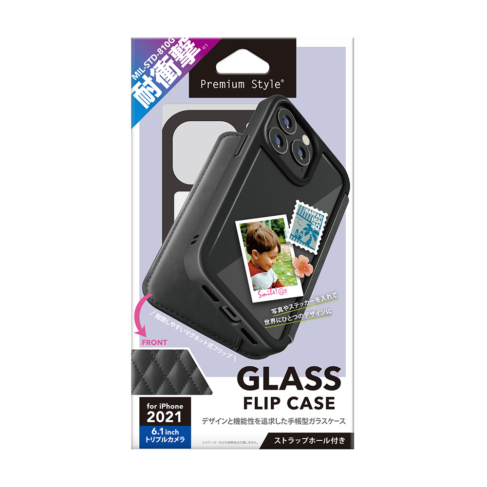 オリジナリティと機能性を追求した2021年 iPhone 6.1inch トリプルカメラ用 ガラスフリップケースです。MIL規格(MIL-STD-810G)の2項目、落下・振動に準拠した試験をクリアしたタフ設計。ケースの内面にはマグネットロック機能搭載でラクラクカバーを開閉することが可能。背面はクリアガラス仕様なのでシールや写真を入れて自分好みにカスタマイズすることが出来ます。通勤通学やお買い物に便利なカードポケット・お手持ちのストラップをつけて落下を防げるストラップホール付き。特許取得済みです。