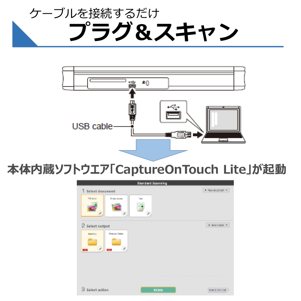 キヤノン電子の特許技術により、一般的なスキャナーと違い、ソフトウエアをパソコンにインストールする必要がありません。付属のUSB ケーブルでパソコンと接続するだけで、スキャナー本体に内蔵されているソフトウエア「CaptureOnTouch  Lite」が起動し、簡単にスキャンすることが可能です。