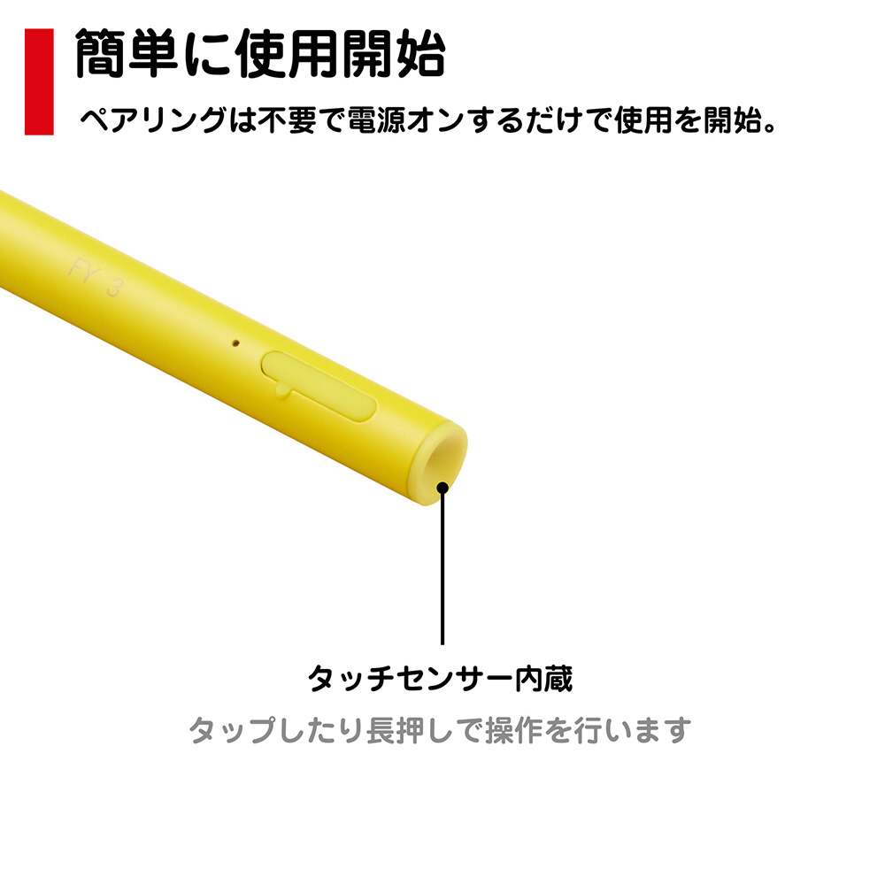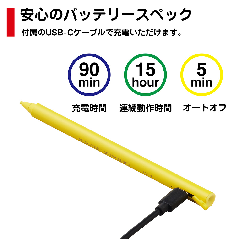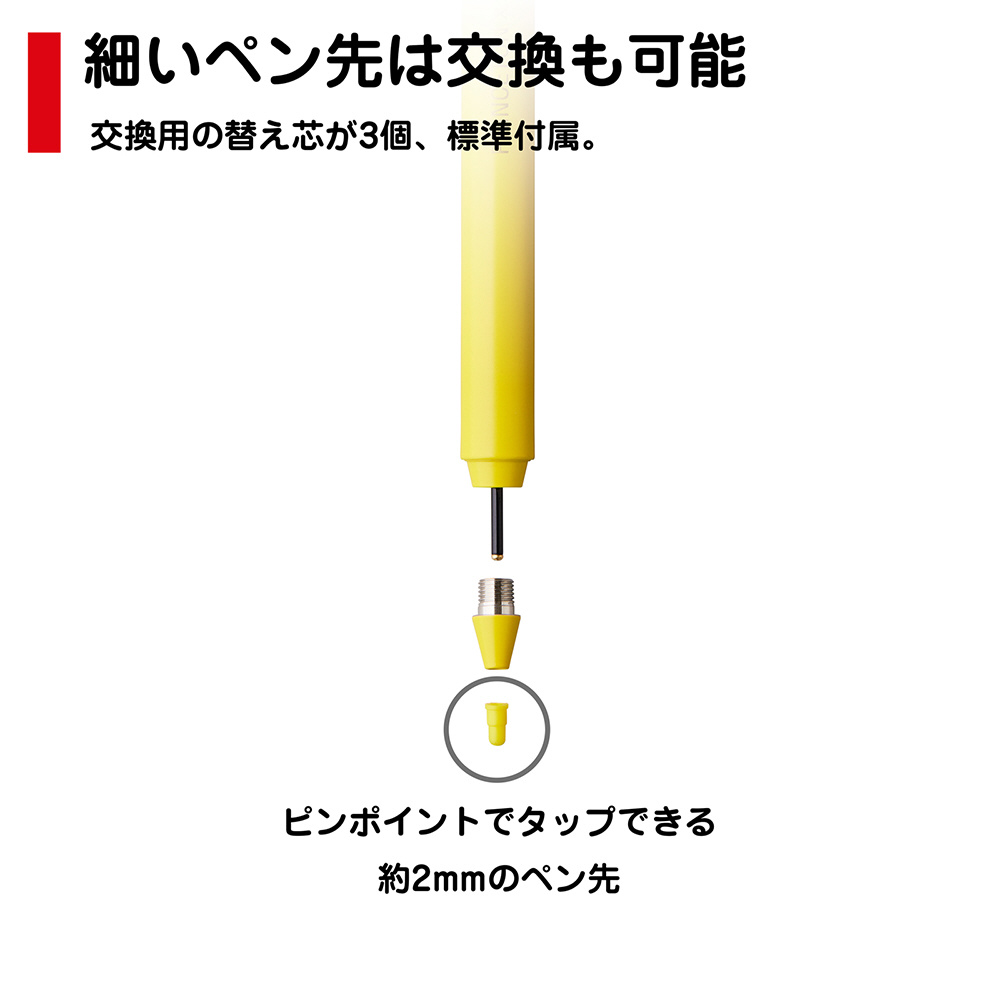 | 仕様2 | [外形寸法]直径約9 (先端部2.) × (H)142mm [質量]11g [ペン先素材]シリコン [電源]内蔵リチウムイオン充電池 [充電時間]約9分 [連続動作時間]約15時間 [オートオフ]約5分 [汎用モード]パームリジェクション:× [iPad モード]パームリジェクション:〇 [同梱品]本体、替え芯× 3 本、充電用USB ケーブル(A-C)約3cm、ユーザーズガイド/保証書  |