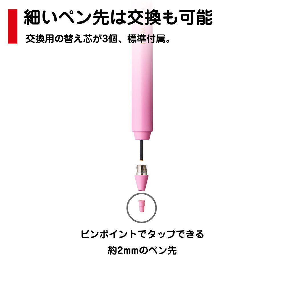 | 仕様2 | [外形寸法]直径約9 (先端部2.) × (H)142mm [質量]11g [ペン先素材]シリコン [電源]内蔵リチウムイオン充電池 [充電時間]約9分 [連続動作時間]約15時間 [オートオフ]約5分 [汎用モード]パームリジェクション:× [iPad モード]パームリジェクション:〇 [同梱品]本体、替え芯× 3 本、充電用USB ケーブル(A-C)約3cm、ユーザーズガイド/保証書 |