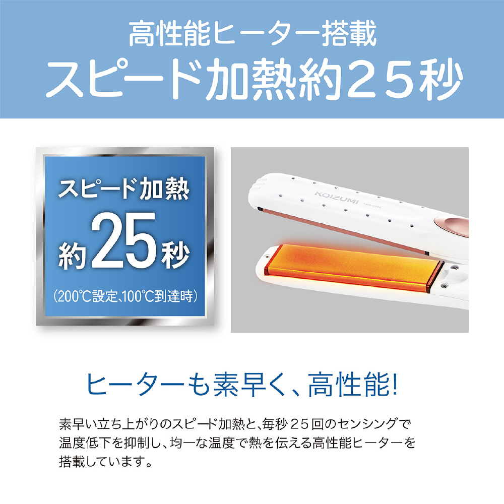 スピード加熱25秒(200℃設定、100度到達時)200℃の高温タイプ。5段階の温度調節(20℃刻み)。プレートロック&自動電源OFF約60分。WET&DRY機能。余分な水分を穴から蒸発させるため、濡れた髪でも使用可能。