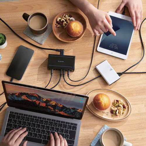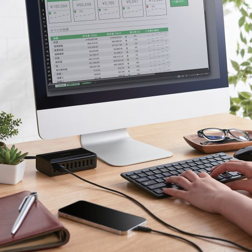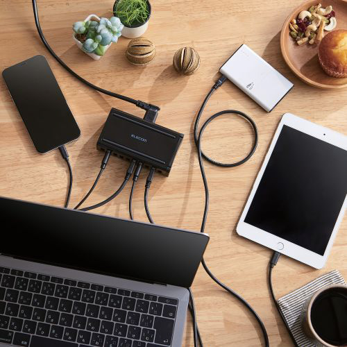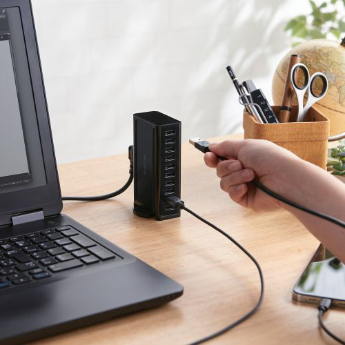 さまざまなUSB機器をこれ一つで同時に充電できるAC充電器です。 USB-Aポートを10ポート搭載し、1ポート最大出力12W(5V/2.4A)で、10ポート同時に合計最大出力60W(5V/12A)で充電できます。 縦置き、横置きにどちらにも対応し場所をとらずにご使用いただけます。