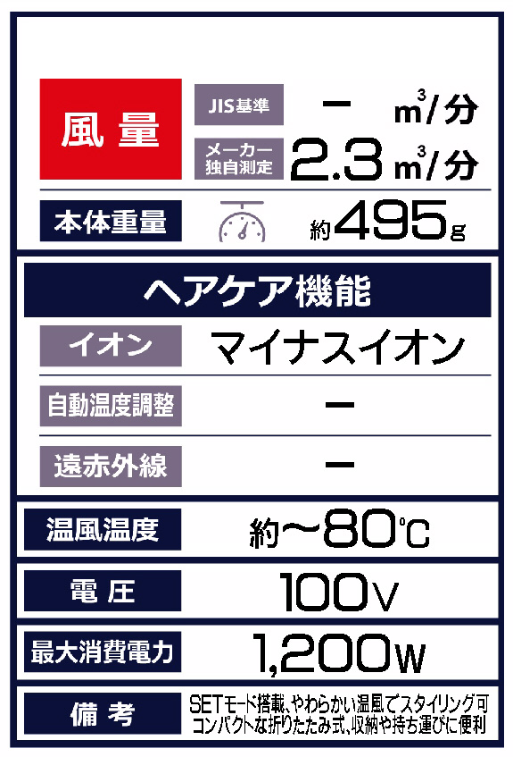 スタイリッシュなグレーカラーはデザイン性も抜群。髪にやさしいマイナスイオン機能を搭載し、大風量でより強い風速乾を実現。熱に当たる時間が短くなるため、ダメージをもっと少なく。