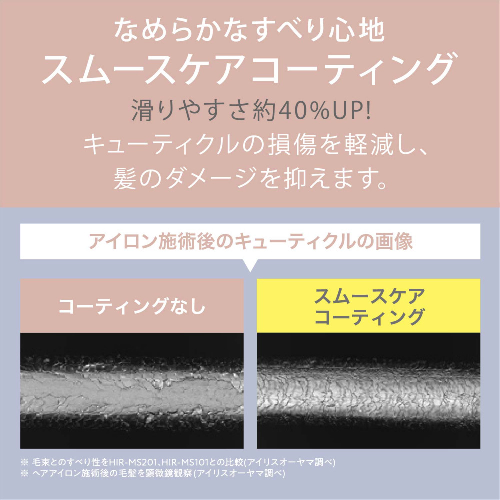 スムースケアコーティングで、すべりやすさが40%UP。摩擦によるキューティクルの損傷を防ぎます。(※HIR-MC101と比較)