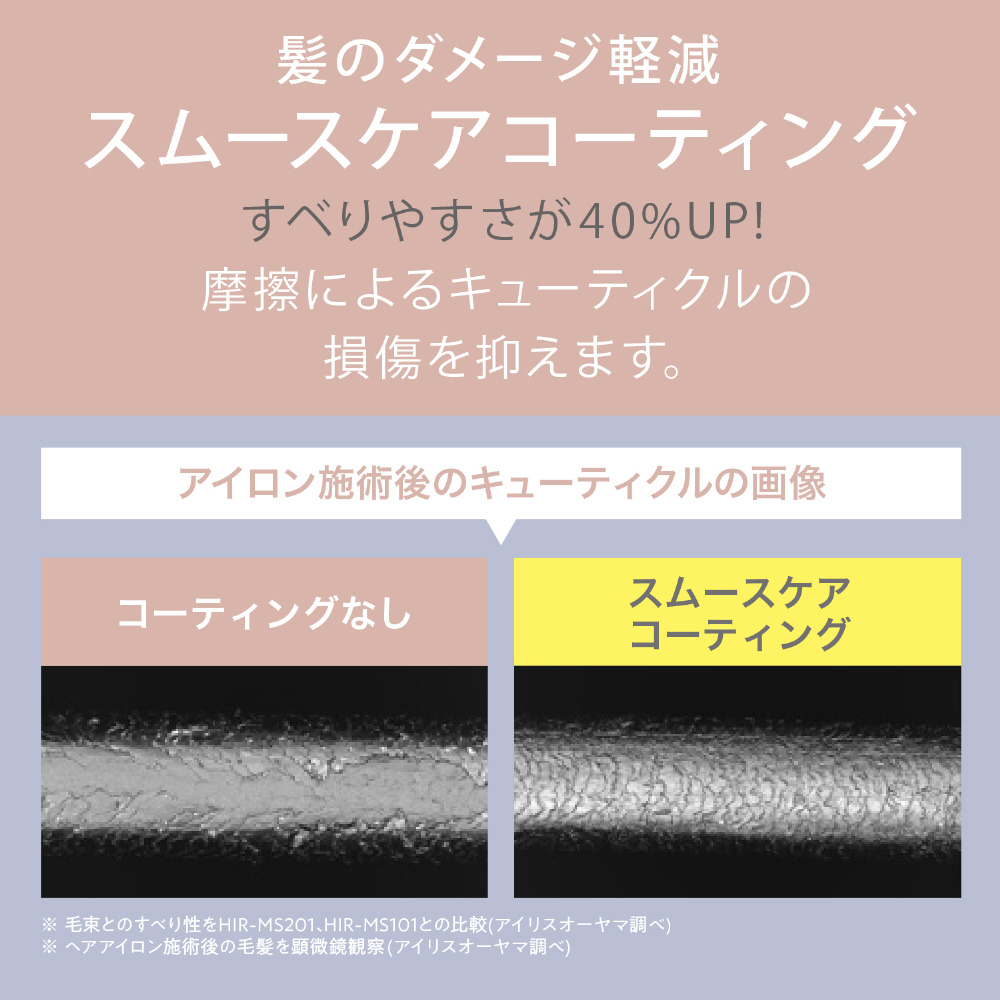 ■スムースケアコーティングで、すべりやすさが40%UP。摩擦によるキューティクルの損傷を防ぎます。(※HIR-MS101との比較)