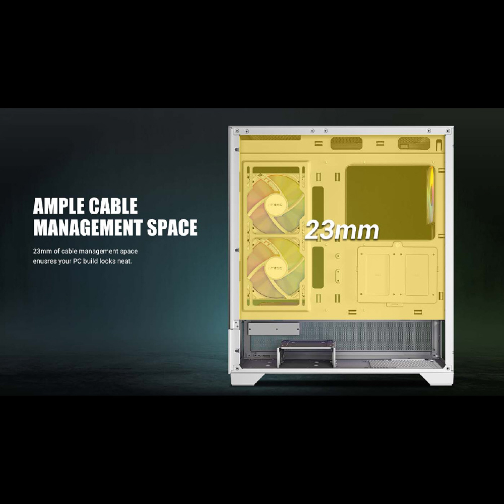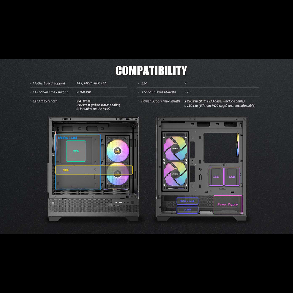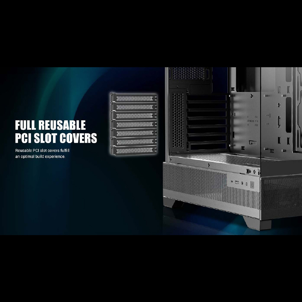 CX700 RGB ELITEは、fixed mode RGBファン6個を標準搭載したピラーレスのATX対応ミドルタワーPCケースです。トップとボトムに2つの脱着式ダストフィルターを備えるほか、最大で410 mmを確保した拡張カードスペース、高さ最大160 mmまでのCPUクーラーに対応、3.5/2.5インチ共用シャドウベイと2.5インチ専用シャドウベイを備えています。
