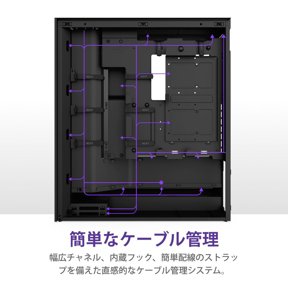 背面にはケーブル管理のための幅広チャンネル、内蔵フック、ストラップが備えられており、直感的なケーブルマネジメントを行う事が可能となっています。