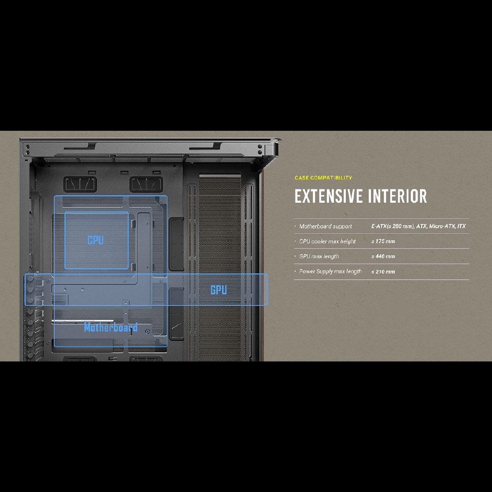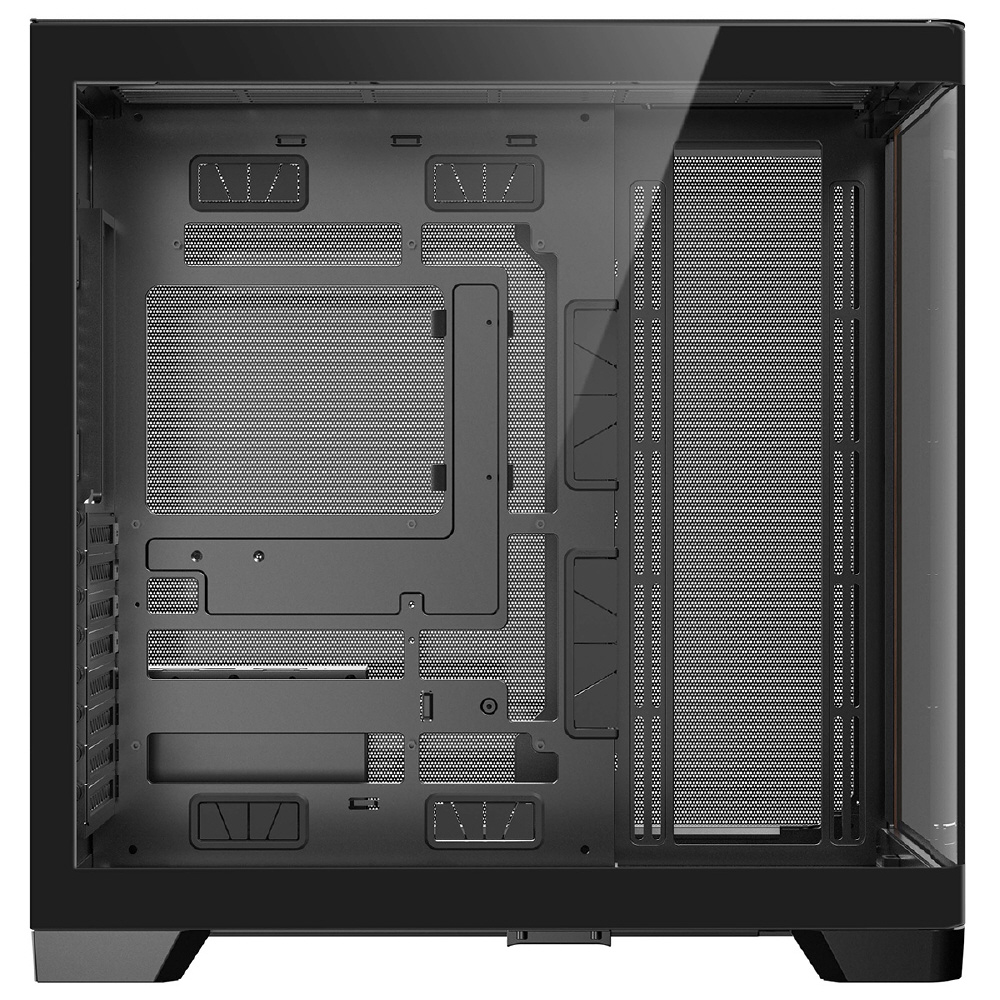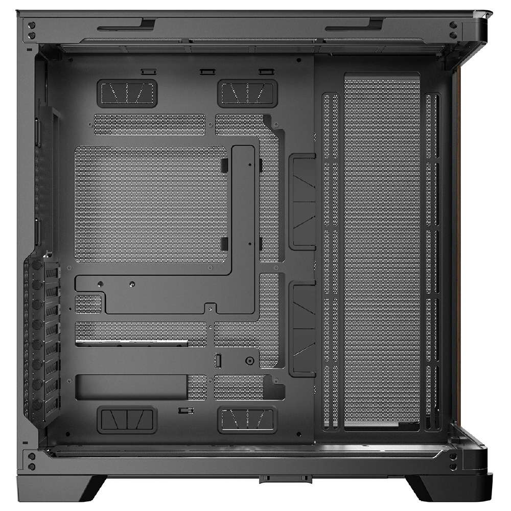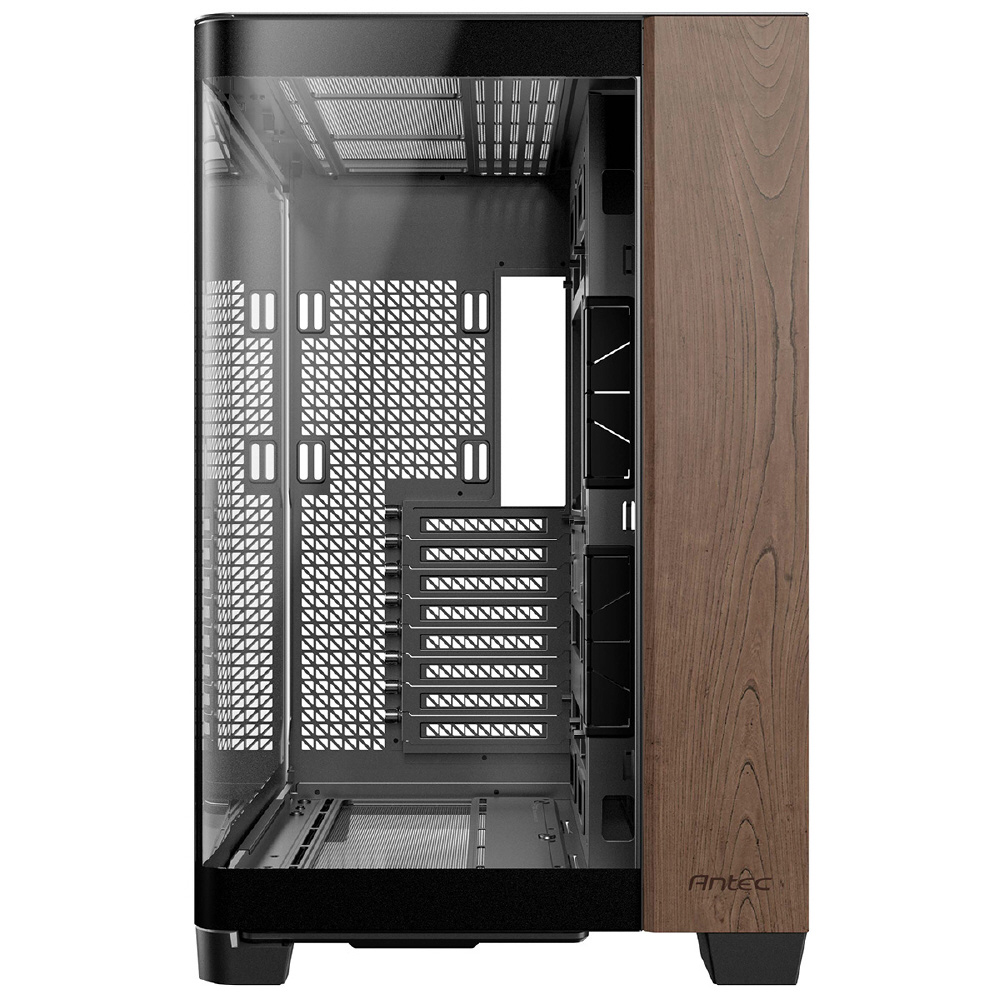 C8 Curve Woodは、フロントとサイドが一体型になった強化ガラスパネルと木製ウォルナット材のフロントパネルを搭載し、右側はメッシュのスチールパネルを搭載したE-ATXマザーボード対応のフルタワーPCケースです。