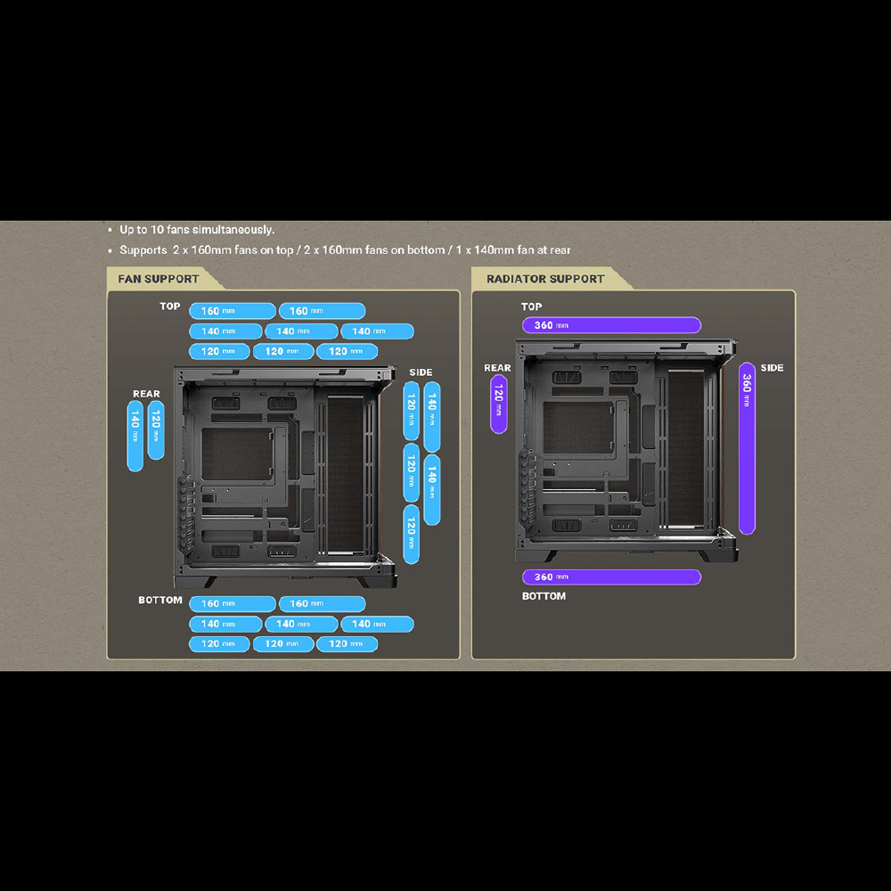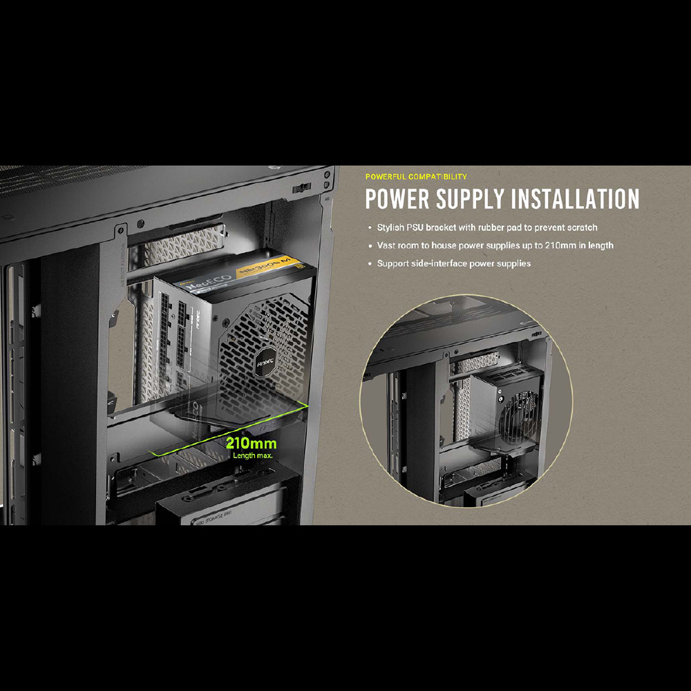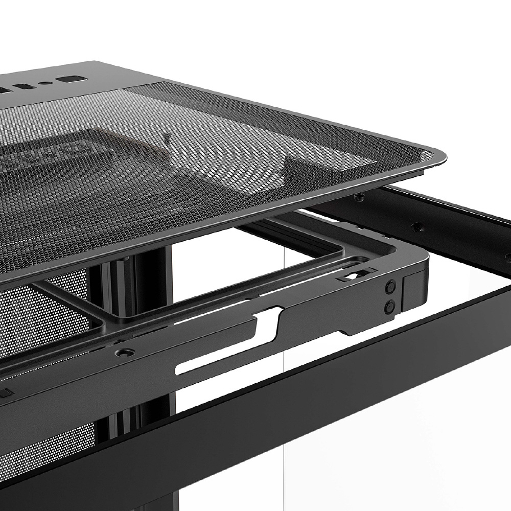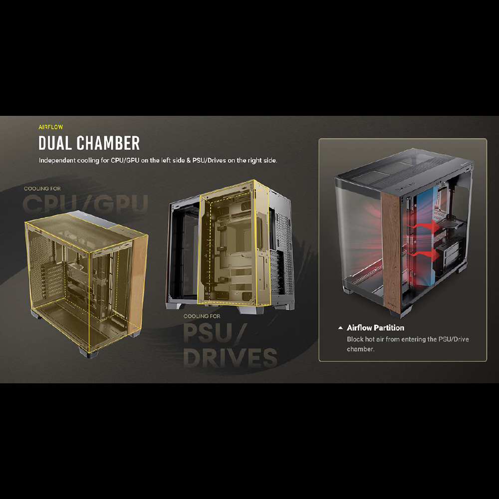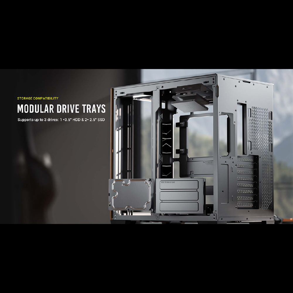 C8 Curve Woodは、フロントとサイドが一体型になった強化ガラスパネルと木製ウォルナット材のフロントパネルを搭載し、右側はメッシュのスチールパネルを搭載したE-ATXマザーボード対応のフルタワーPCケースです。
