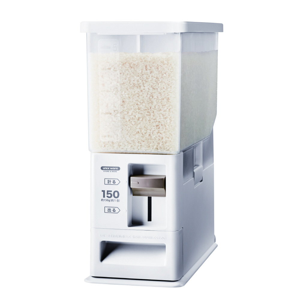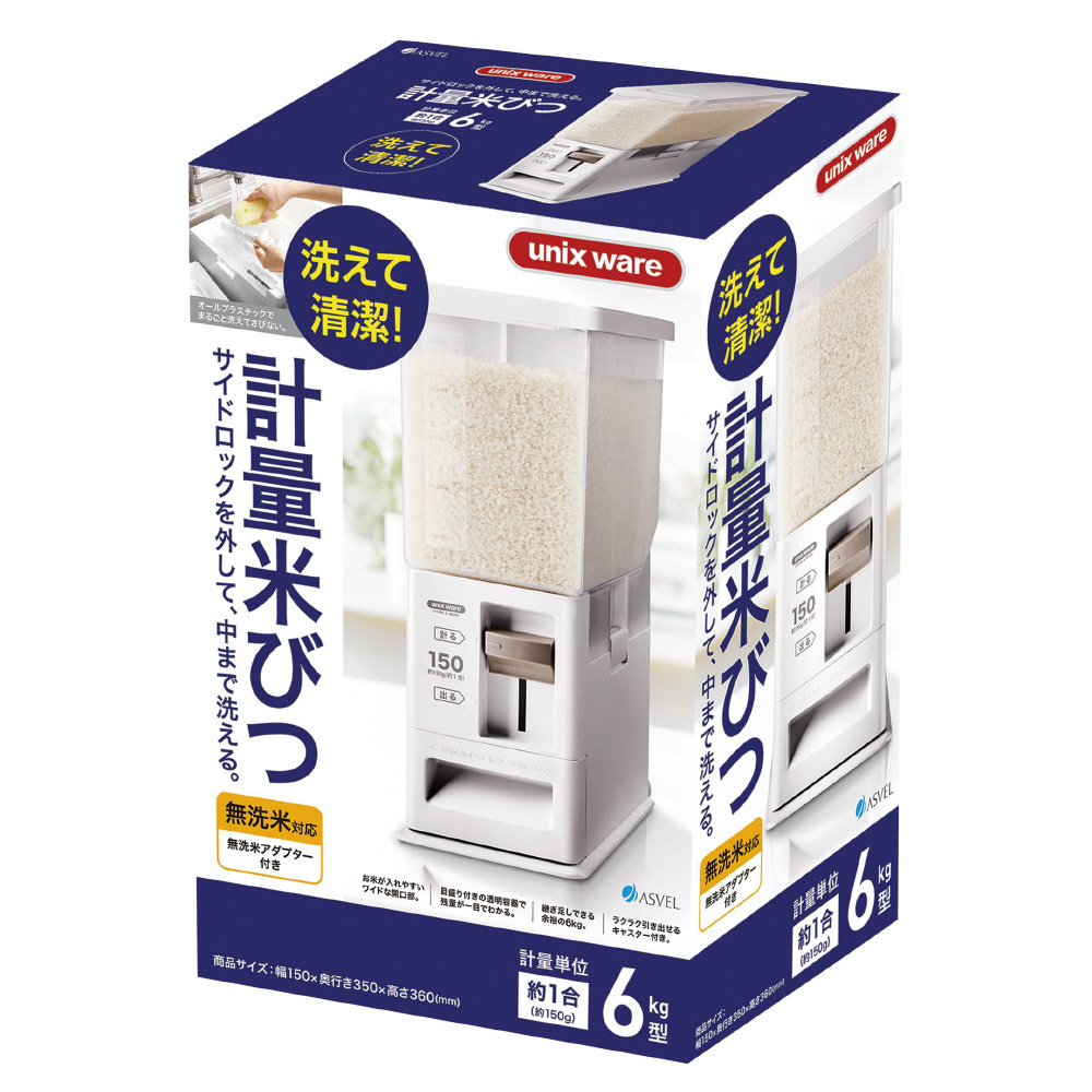 オールプラスチックなので丸ごと洗える計量米びつです。丸洗いしてもサビる心配がありません。1合ずつ量ることができて、目盛り付きの透明容器で残りのお米の量がわかります。5kgのお米がすっぽり入るサイズです。付属アダプターを付けることで無洗米にも対応可能です。米びつの上から補充ができてとても楽です。キャスター付きで動かしやすく、重くても動かすことができます。【仕様】容量:6kg