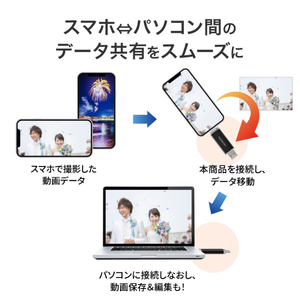 また、”USB-Aポート搭載のパソコン”と”USB-Cポート搭載のスマホ”など、端子が異なる機器どうしでのデータ共有が簡単に行えます。