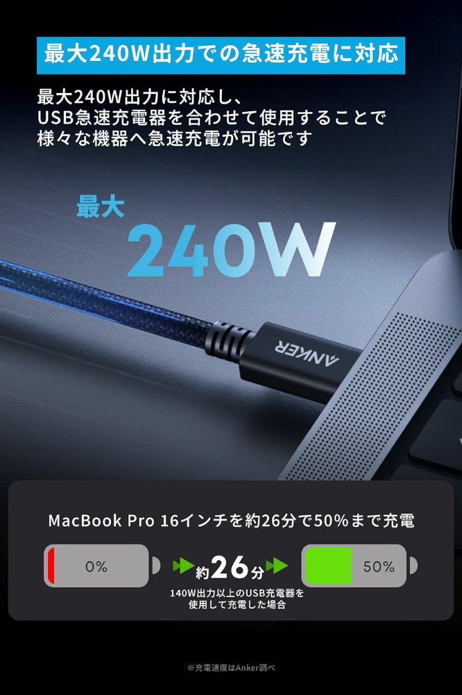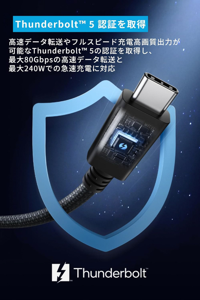 「Anker Prime USB-C & USB-C ケーブル Thunderbolt 5 (240W、80Gbps)1.0m」