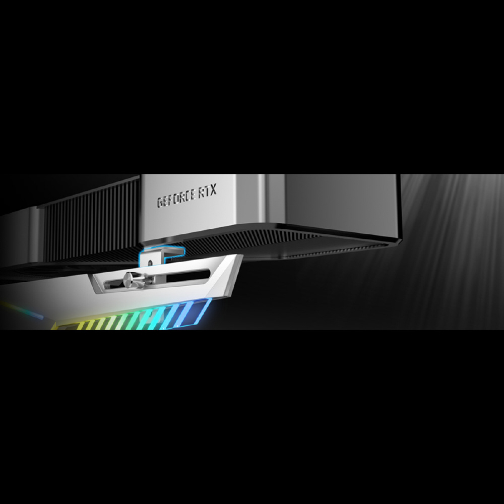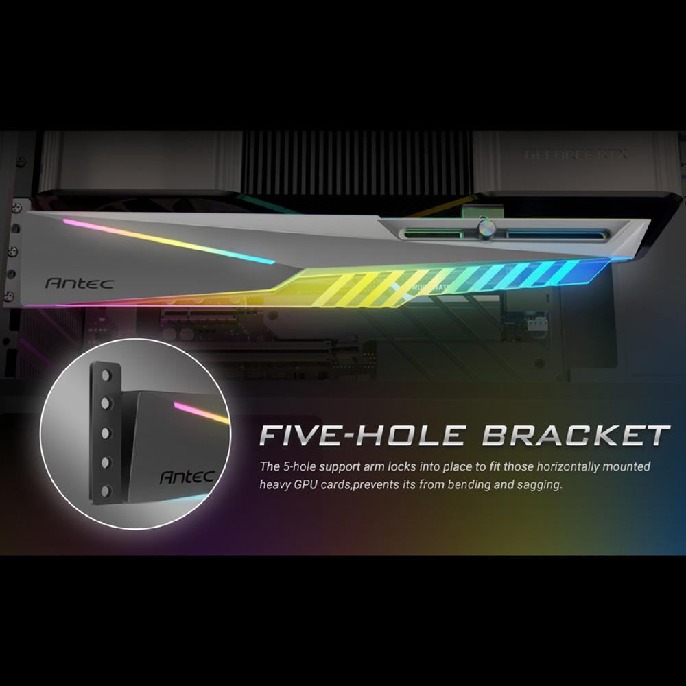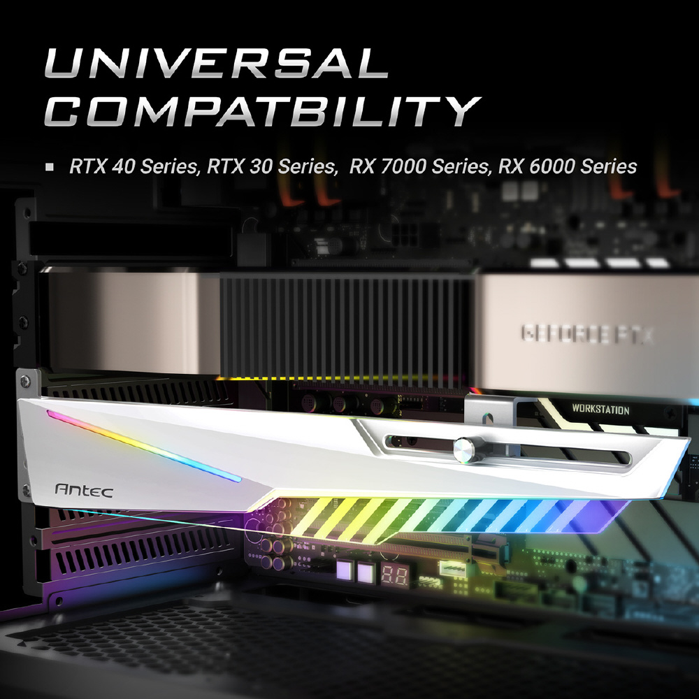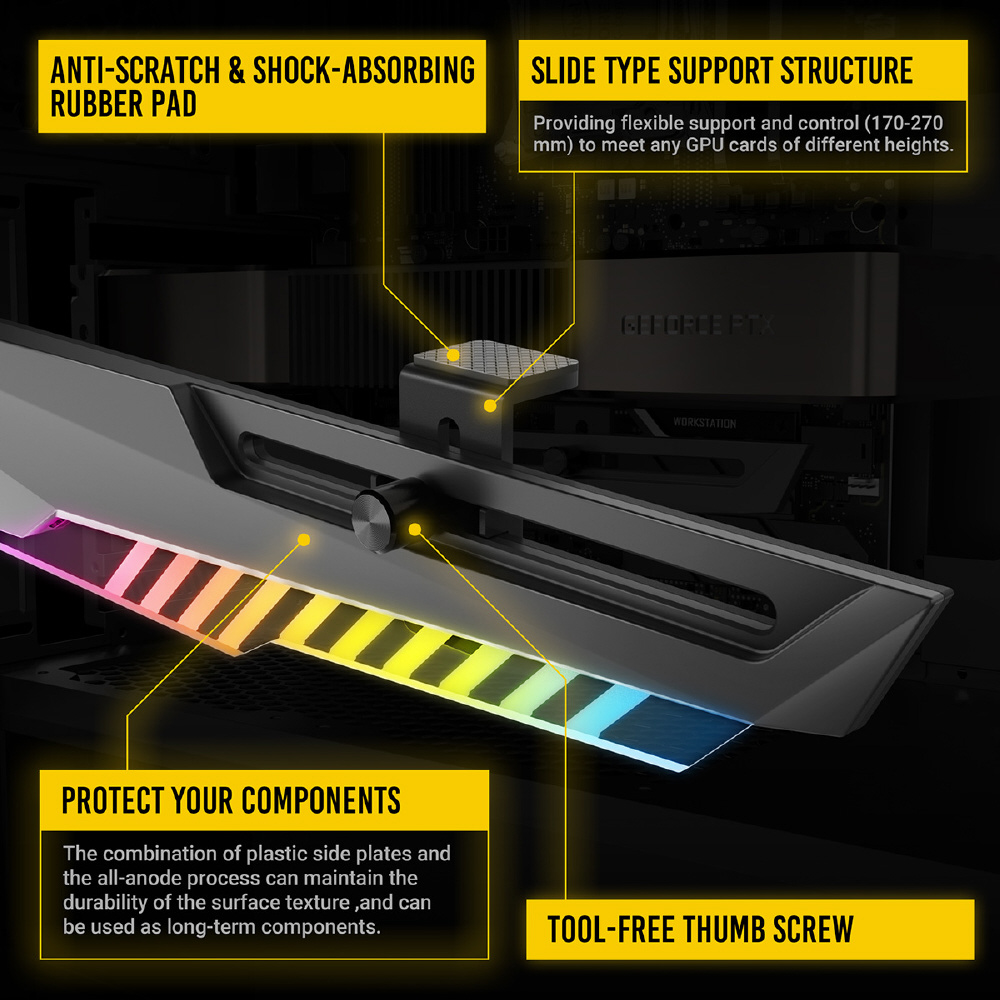 GPUの空いている隙間に固定出来るので、大きいGPUを下からしっかりと支える事ができます。調整はネジ式になっており幅は170-270 mmまで対応、高さは40-65 mmまで対応しています。3PIN ARGB SYNCに対応しておりマザーボード又はコントローラーを介して光制御に対応しています。NVIDIA Geforce RTX、AMD Radeonなど各種GPUに対応しています。