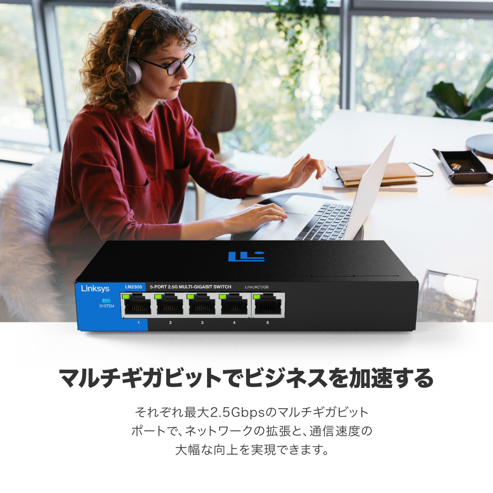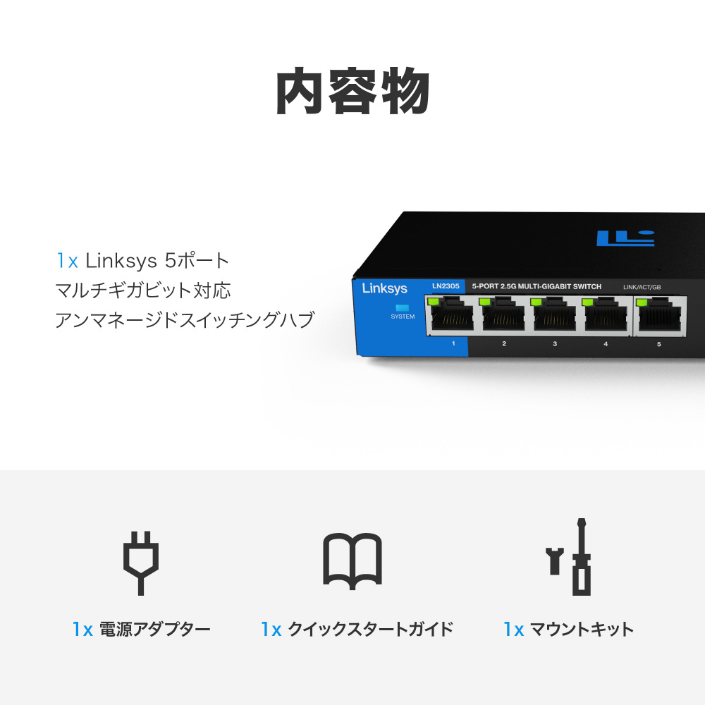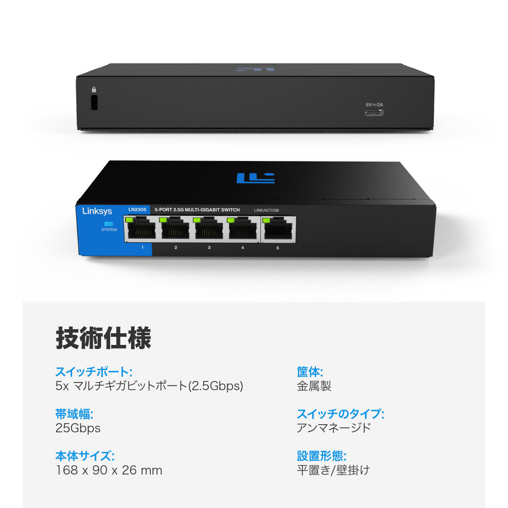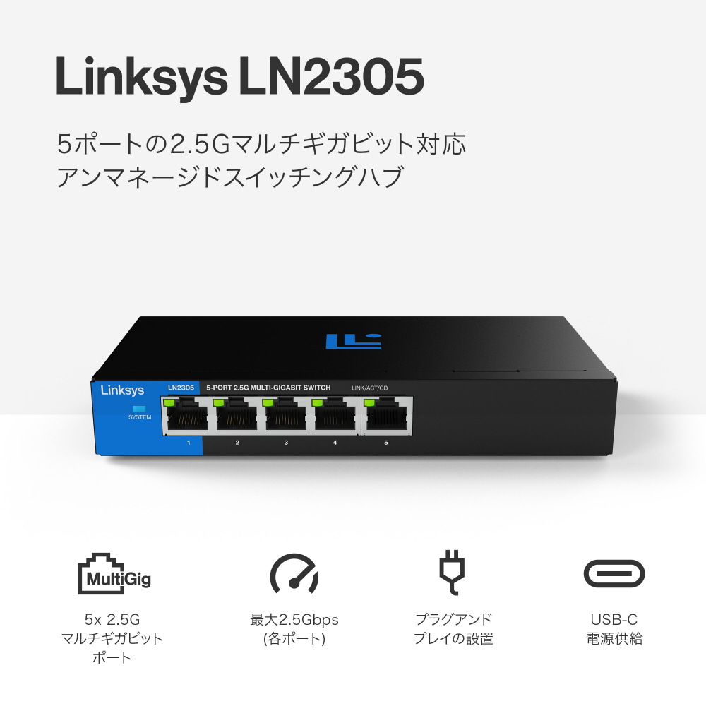 スイッチングハブ [5ポート /2.5Giga対応 /ACアダプタ] LINKSYS 5-PORT 2.5G MULTI-GIG UNMANAGED SWITCH(USB-Cメス給電対応) LN2305-AH