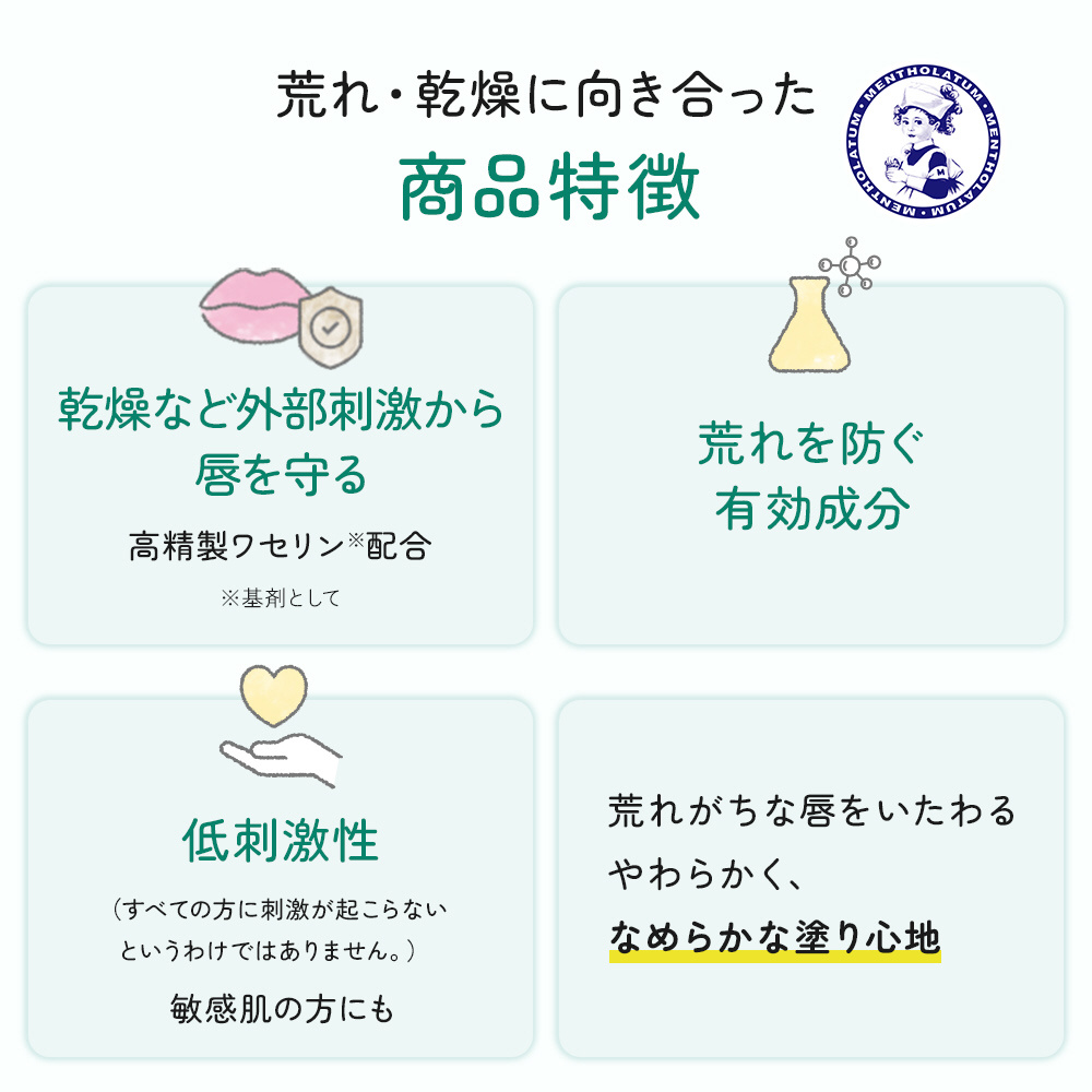 唇をいたわりながら荒れ・乾燥を防ぐ薬用リップ。しっとりやわらか、なのにべたつかない、唇のことを考え抜いた塗り心地。高精製ワセリン※配合。乾燥などの外部刺激から唇を守ります。おやすみ前や唇が荒れているときの口紅の下地にも。無香料タイプ。 ※ワセリン(基剤として)