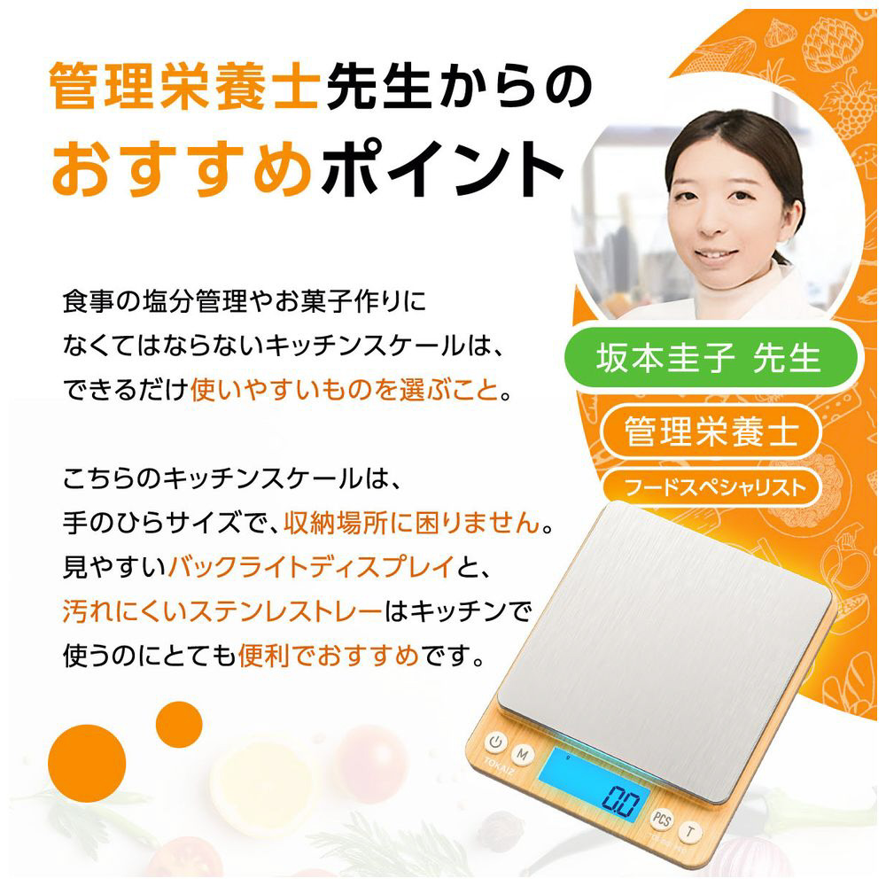 管理栄養士がオススメ!日本地域設定機能付きのデジタルキッチンスケール。0.1g単位の精密計測から最大3kgまで対応し、料理やお菓子作り、コーヒーの抽出まで幅広く活躍。スタイリッシュなデザインでキッチンを彩り、便利なトレー2枚も付属した、おしゃれで実用的な必需品です。