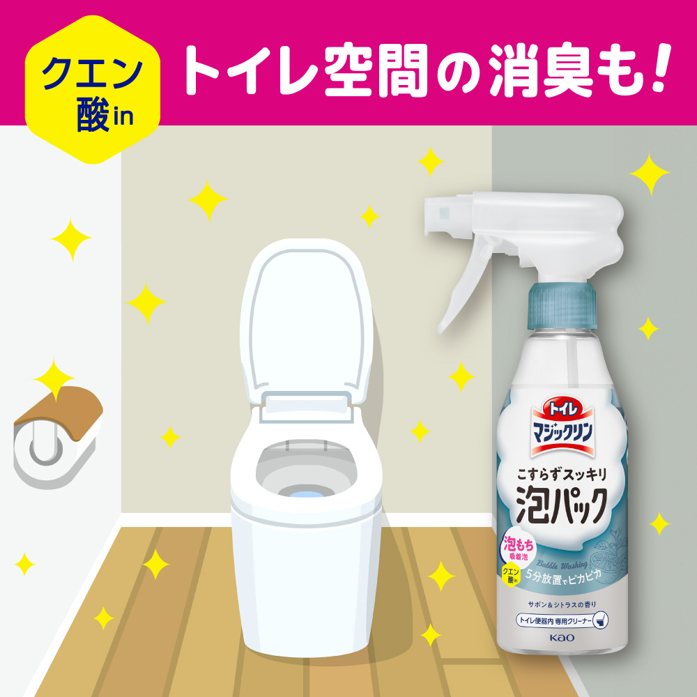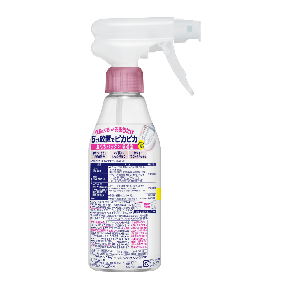 泡もちバツグン※1吸着泡で便器をぐるっとおおうだけ。ほったらかして(5分以上放置)トイレピカピカ!※2 ゴシゴシいらず※2でラクラクきれい!消臭もできるクエン酸in処方のトイレ便器内専用クリーナー!逆さスプレーできるから、フチ裏もしっかりパック。おそうじを楽しむホワイトフローラルの香り ※1当社品比※2便器内専用、こびりついた汚れは落とせません。