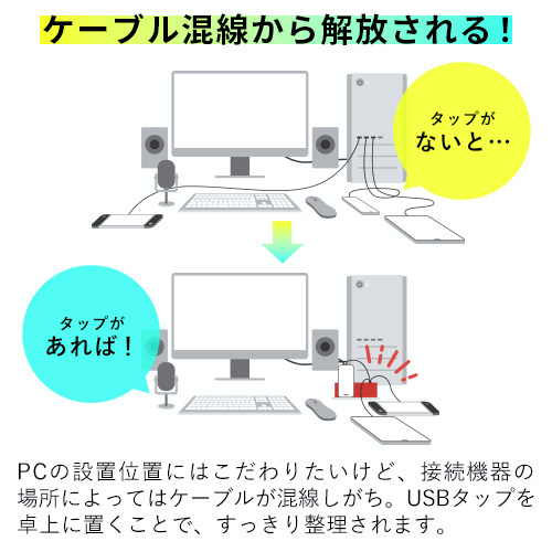 PCの設置位置にはこだわりたいけど、接続機器の場所によってはケーブルが混線しがち。USBタップを卓上に置くことで、すっきり整理されます。