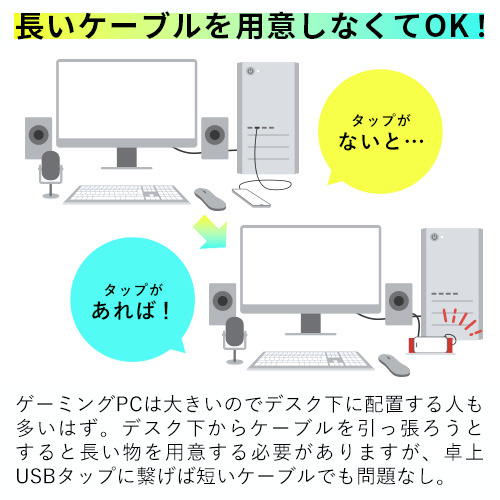 ゲーミングPCは大きいのでデスク下に配置する人も多いはず。デスク下からケーブルを引っ張ろうとすると長い物を用意する必要がありますが、卓上USBタップに繋げば短いケーブルでも問題なし。