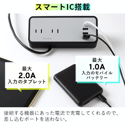 接続する機器にあった電流で充電してくれるので、差し込むポートを迷わない。