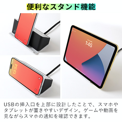 USBの挿入口を上部に設計したことで、スマホやタブレットが置きやすいデザイン。ゲームや動画を見ながらスマホの通知を確認できます。