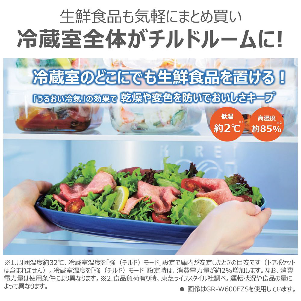 ・「速鮮チルド」東芝の特許技術ツイン冷却により、食品が凍らない-4℃前後の高湿度冷気を送り込み、買い物後に温度が上がった食材を急速に冷やし、鮮度が落ちるのを防ぎます。半解凍状態のため生のままでは柔らかく切りにくい食品もきれいに薄く切ることができます。「解凍モード」は、常温解凍と比較すると解凍時のドリップ量を抑制することができるため、おいしく解凍することが可能です。