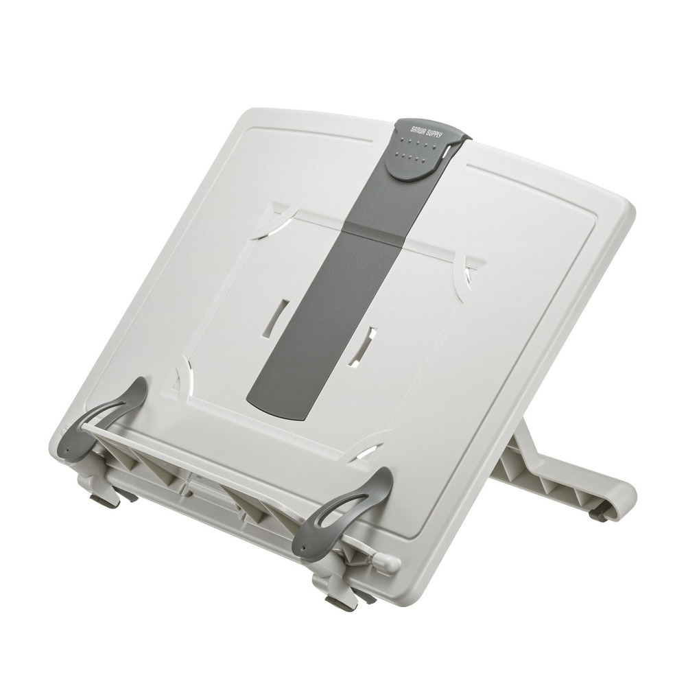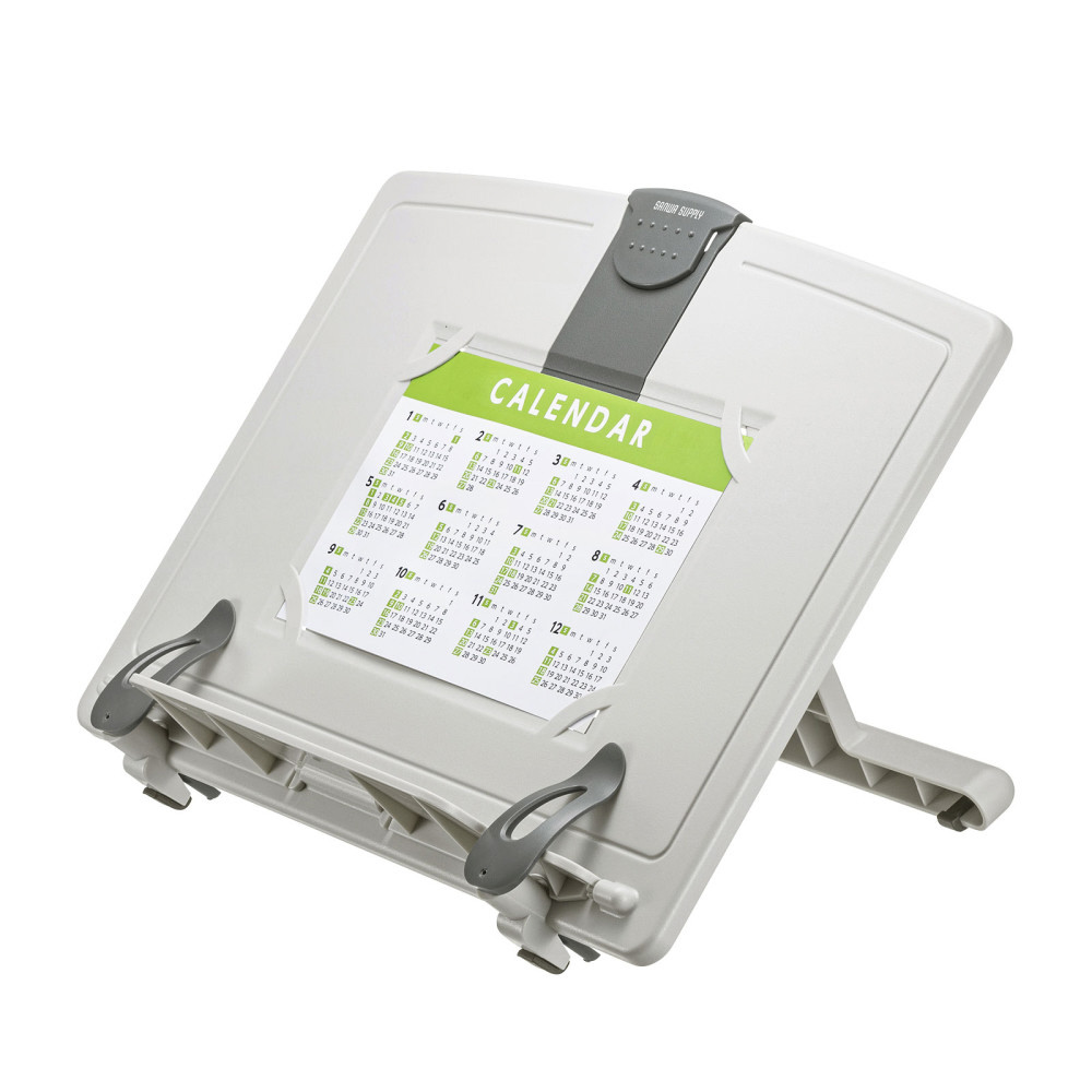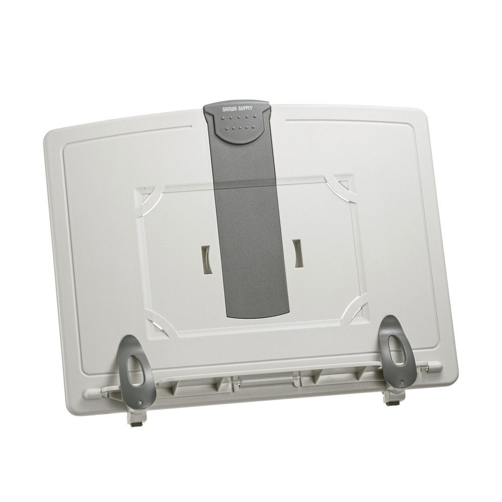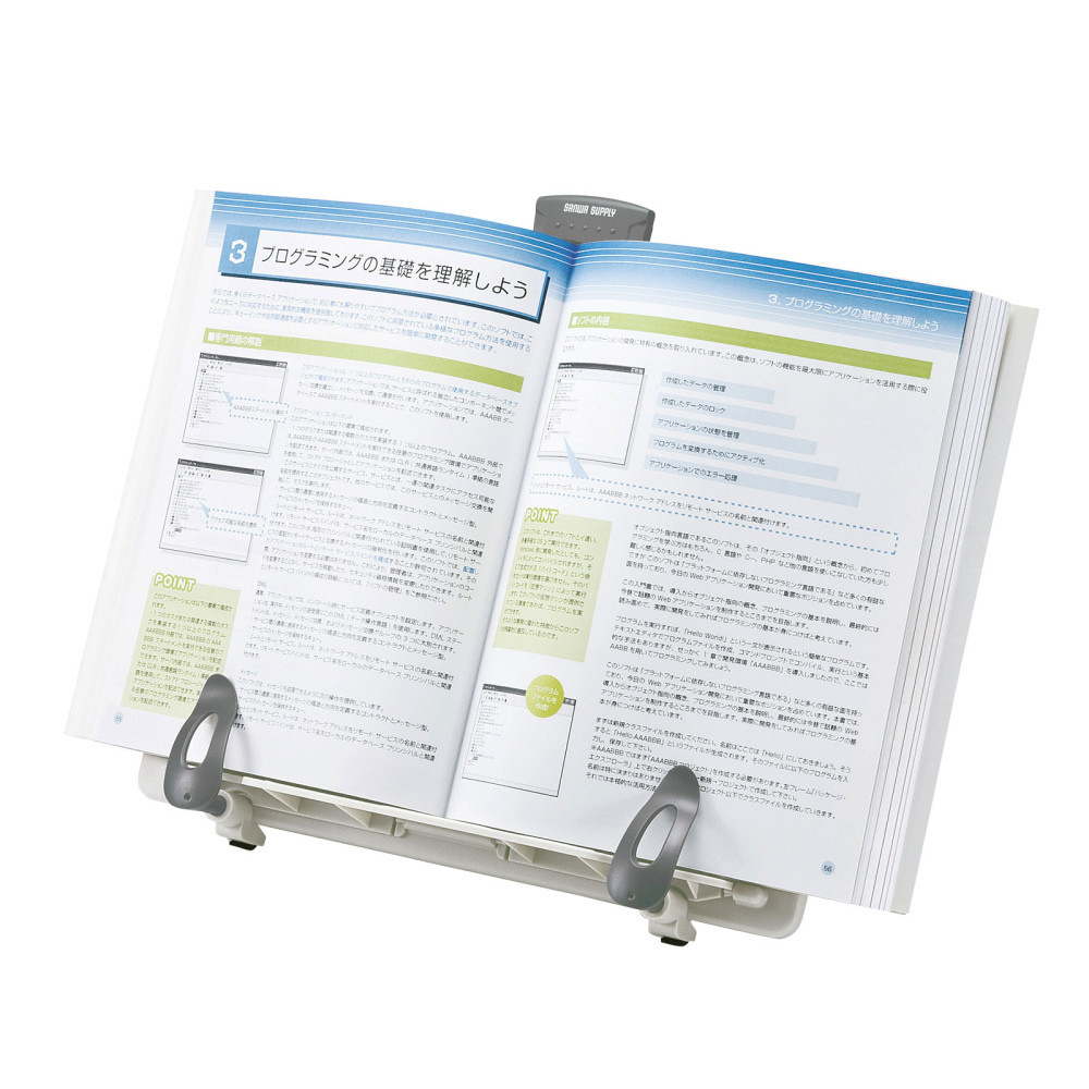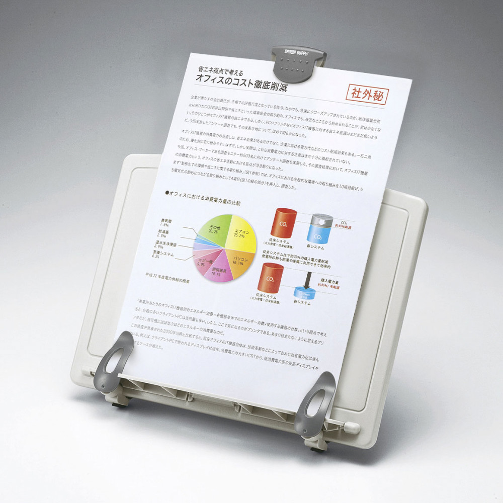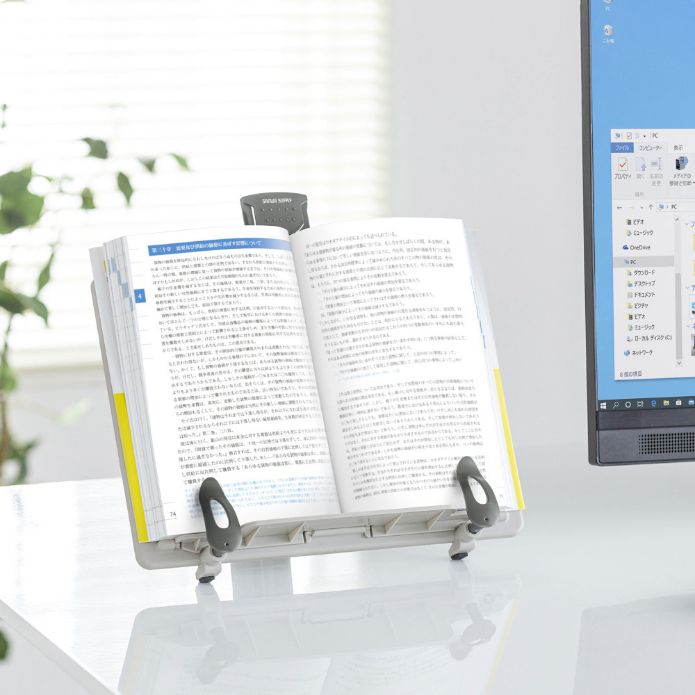 手軽に本をホールド、クリップ付きで原稿台としても使用可能なブックスタンドデータホルダー。ホワイト。