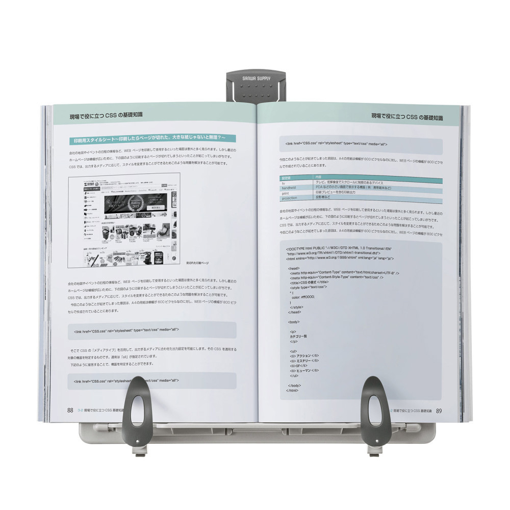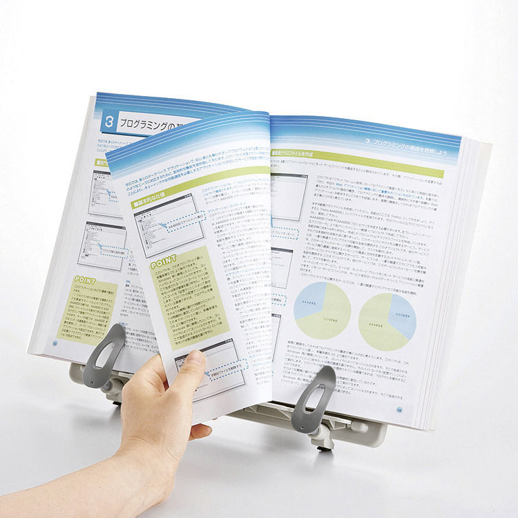 ●厚さ20mmまでの本に対応し、クリップで挟んだままでもページがめくりやすくなっています