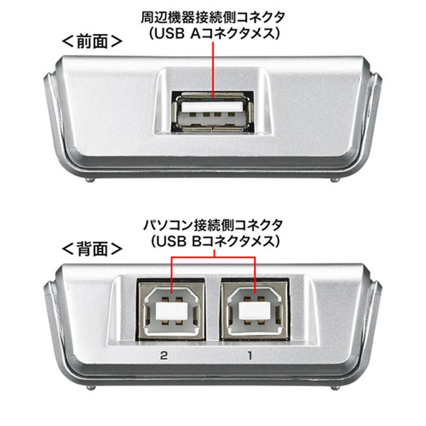 2台のパソコンで1台のUSB2.0対応機器を切り替えて共有できる手動切替器。