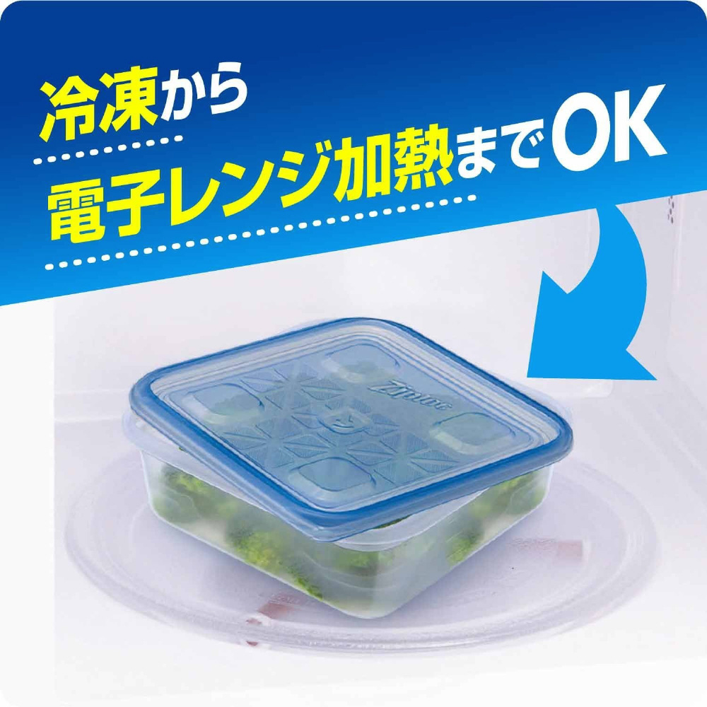 軽くて丈夫なプラスチック製保存容器です。耐熱温度140℃耐冷温度−20℃で、冷凍保存からフタごと電子レンジ加熱までできます。異なるサイズ同士でも積み重ねて保存でき、使わない時は重ねて収納できます。底面とフタの凹凸で重ねた時にずれにくくなっています。フタの中央部分を押すとパチンと閉まって、しっかり密閉します。中身がひと目でわかる半透明の容器です。容器側面に目盛りが付き内容量が確認できます。