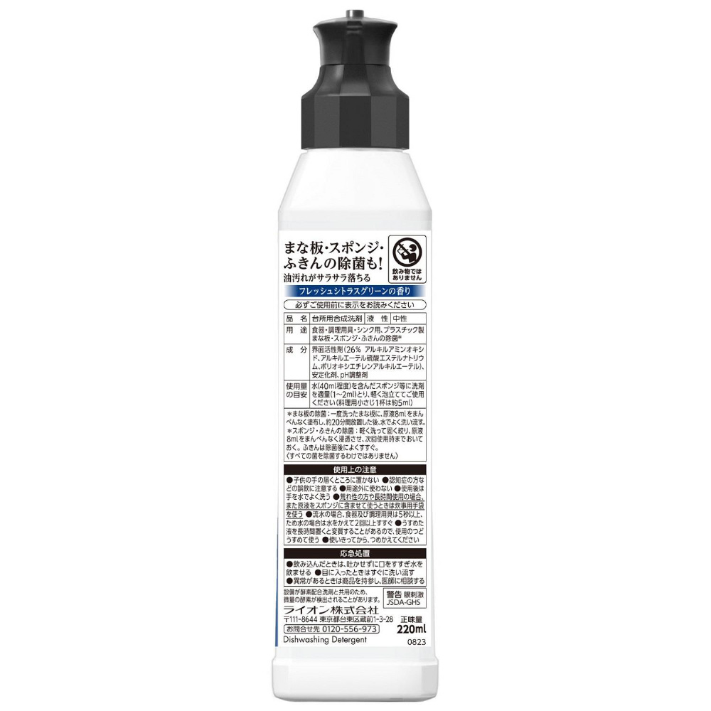 ベタつく油汚れも「サラサラ落とせて」、まな板・スポンジ・ふきんの除菌もできるナノ洗浄の台所用洗剤です●独自のメカニズムで、手ごわい油汚れも従来より細かくナノレベルまで分解します●洗い始めからすすぎ終わりまでヌルつきなく水のように「サラサラ落とせて」、手早く食器を洗い上げます●まな板・スポンジ・ふきんの除菌もできます●爽やかなシトラスグリーンの香りです●スタイリッシュなスクエアボトルを採用
