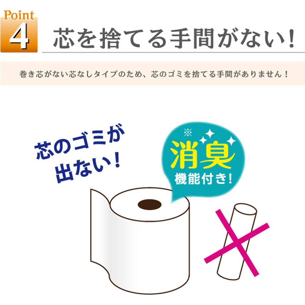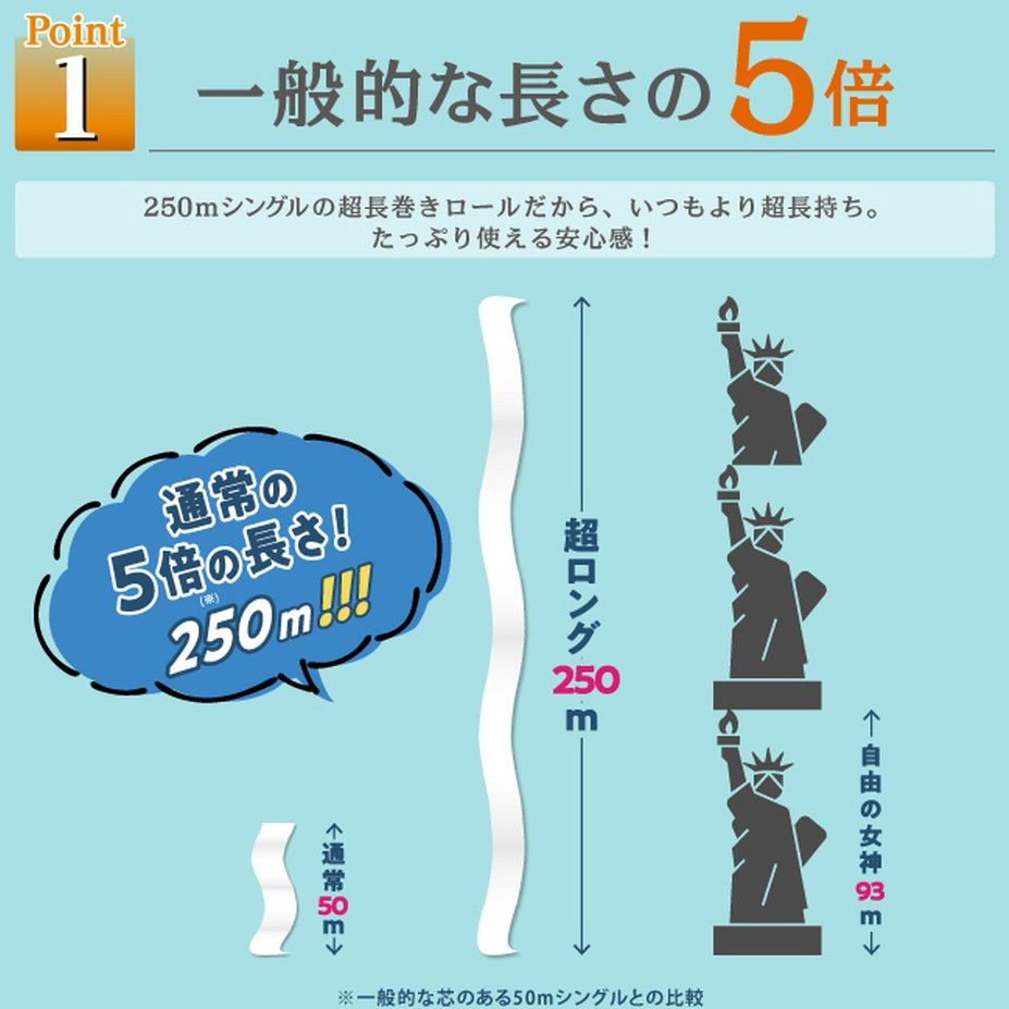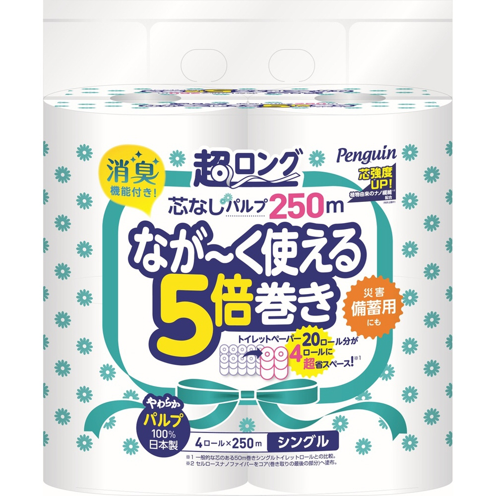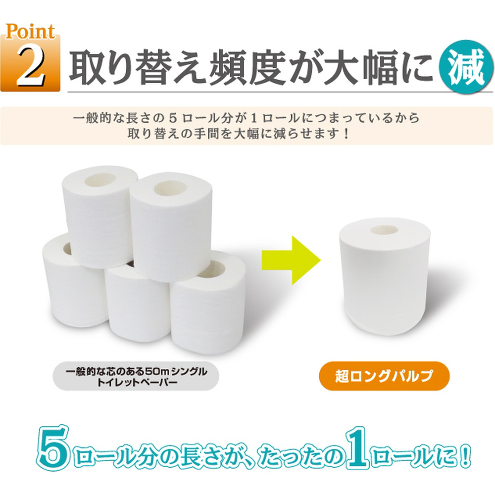 5倍巻きの超ロングトイレットペーパー。パルプ100%で柔らかい紙質。消臭機能付き。備蓄にも最適です。