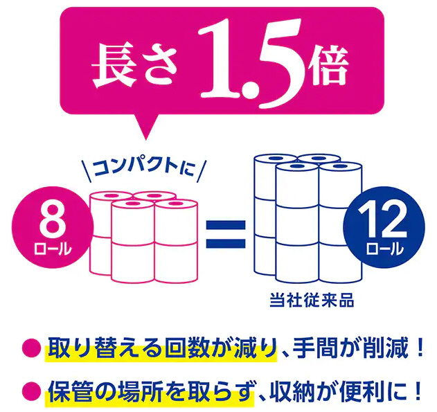 8ロールで12ロール分の長さのトイレットペーパー。