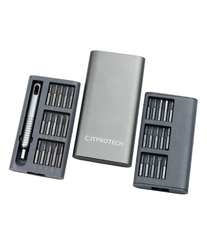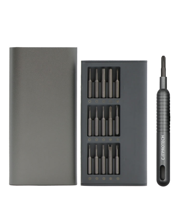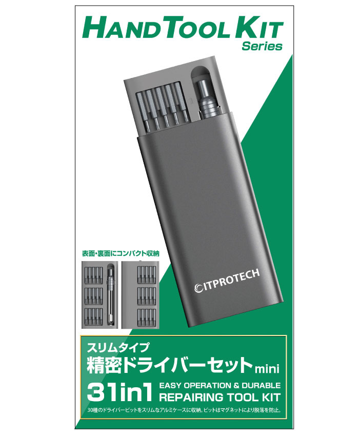 小型の精密ドライバーセットで、スマートフォン、パソコン本体、ゲーム機、カメラなどの修理で細かな作業に最適です。好評の49in1モデル(IPT-DK49)をさらに小型化し厳選された30種のビットと専用のドライバーのセットです。わずか15mm厚のアルミ製ポータブルケースに収納できる設計になっており持ち運びにもとても便利です。