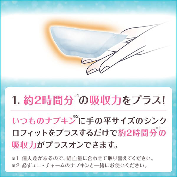 ナプキンとカラダの間のあのスキマにはさんで、いつものナプキンに吸収力をプラスオン。だから、自分のペースで替えられない時もモレ安心。しかもトイレに流せる。