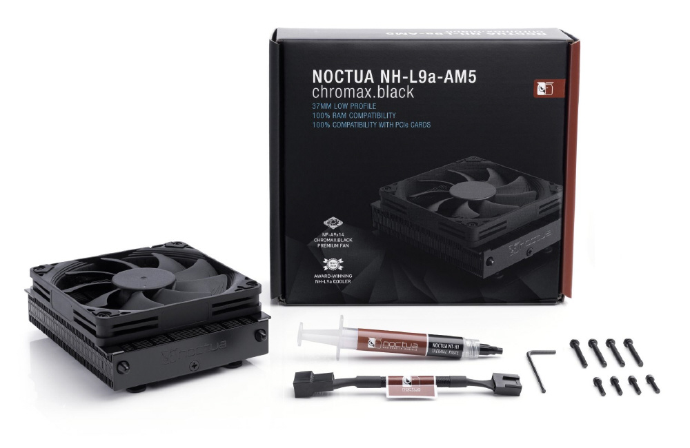 NH-L9a-AM5chromax.blackは、AMD AM5ベースのHTPCおよびスモールフォームファクター(SFF)ビルド向けの、受賞歴のあるNoctuaのNH-L9a-AM5薄型静音CPUクーラーのオールブラックバージョンです。