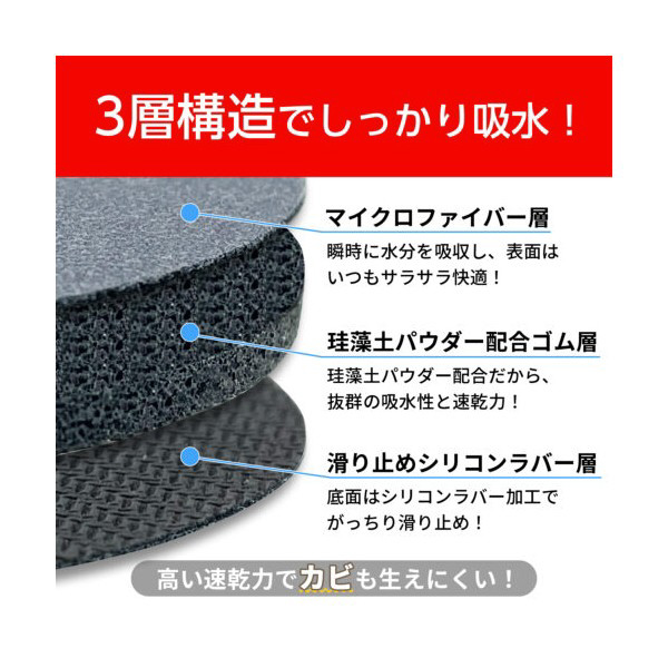 ●マイクロファイバー層、珪藻土パウダー配合ゴム層、シリコンラバー層の3層構造です。