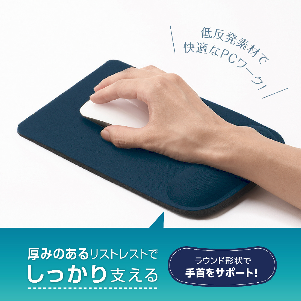 手首をしっかり支える厚みのあるリストレスト付きマウスパッドです。