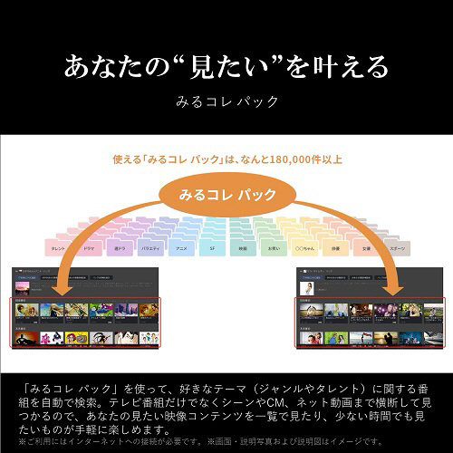 予約録画やおまかせ録画した膨大な番組から、お気に入りのタレントの出演番組や、好きなジャンルの番組を自動で分類。さらに、あなたがよく見る番組をAIが学習しておすすめ。自分では気づかなかった番組にも出会えます。録画した番組も、サムネイルで表示されるので、ネット動画と同じように見たい番組を見つけられます。18万以上のタレントやジャンルが用意されているので、お好みのものに出会えます。