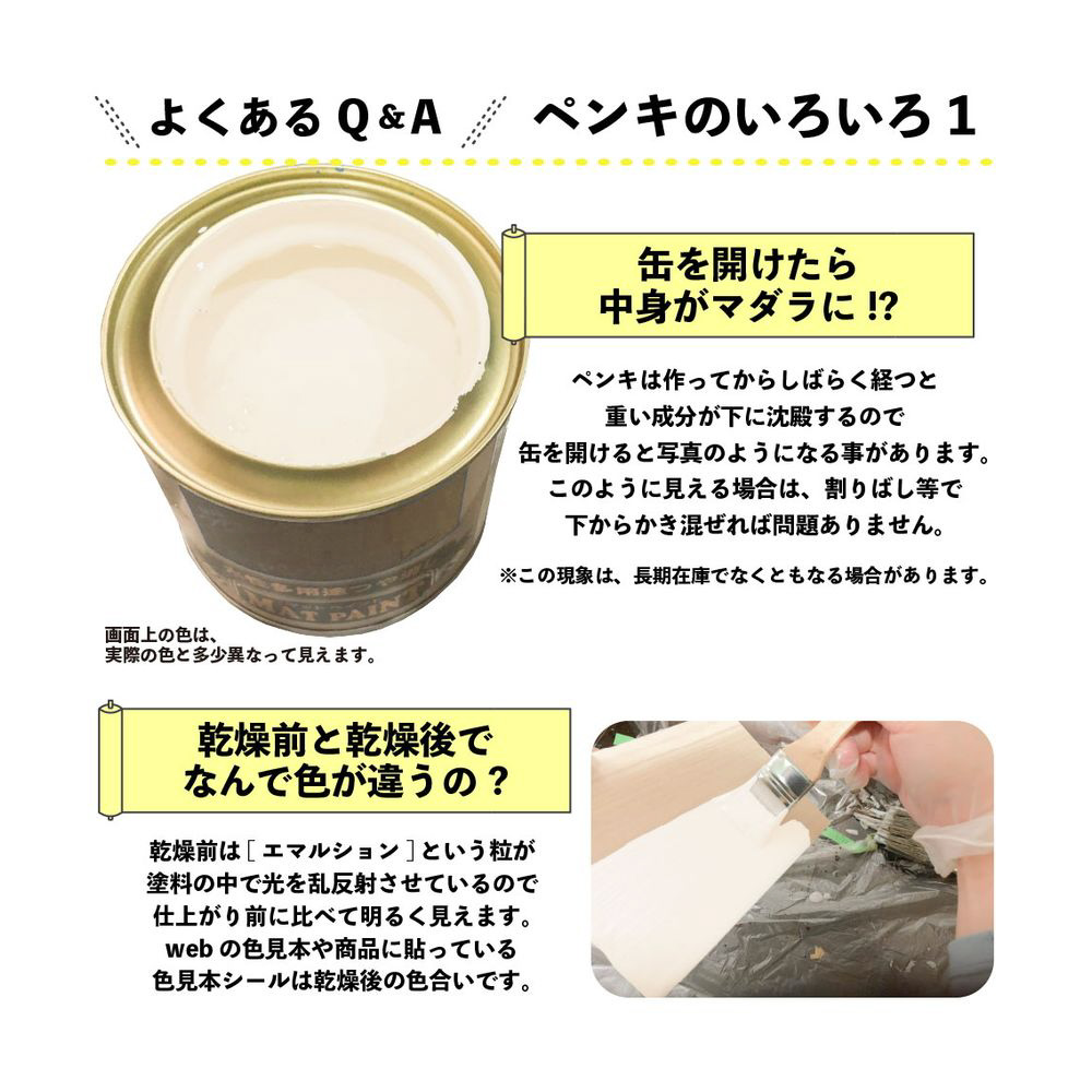 ・[乾燥時間・塗面積について]乾燥時間、塗面積の表示は、気象条件・塗る素材・形状・塗り方などによって多少異なります。
