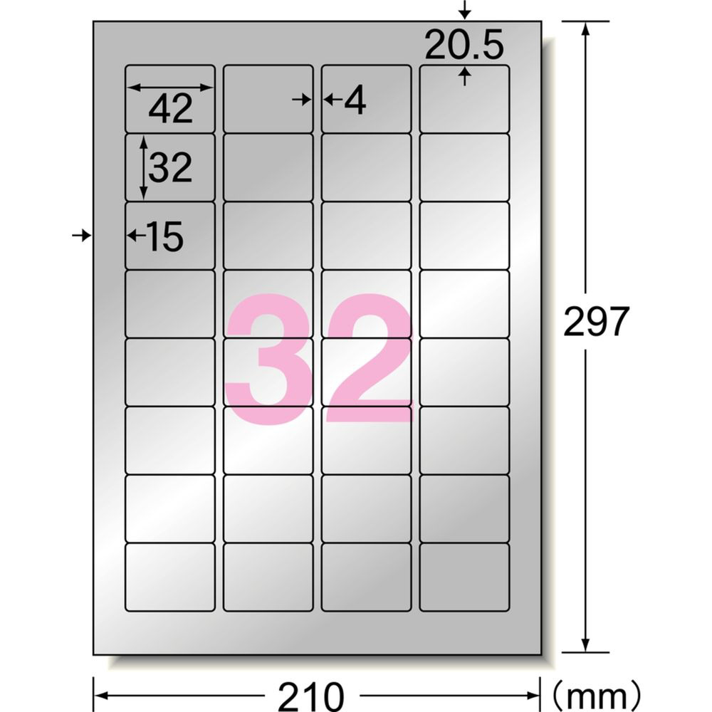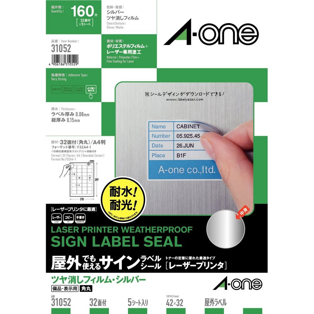 | 商品名 | 31052(ラベル/備品・表示用/レーザープリンタ用/ツヤ消しフィルム/シルバー/より強く貼れるタイプ/A4/1シート32面/5枚入) |