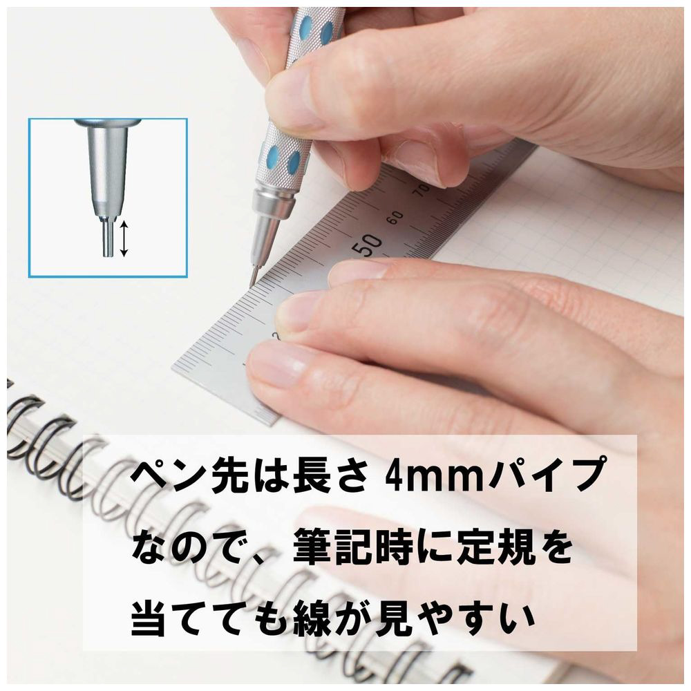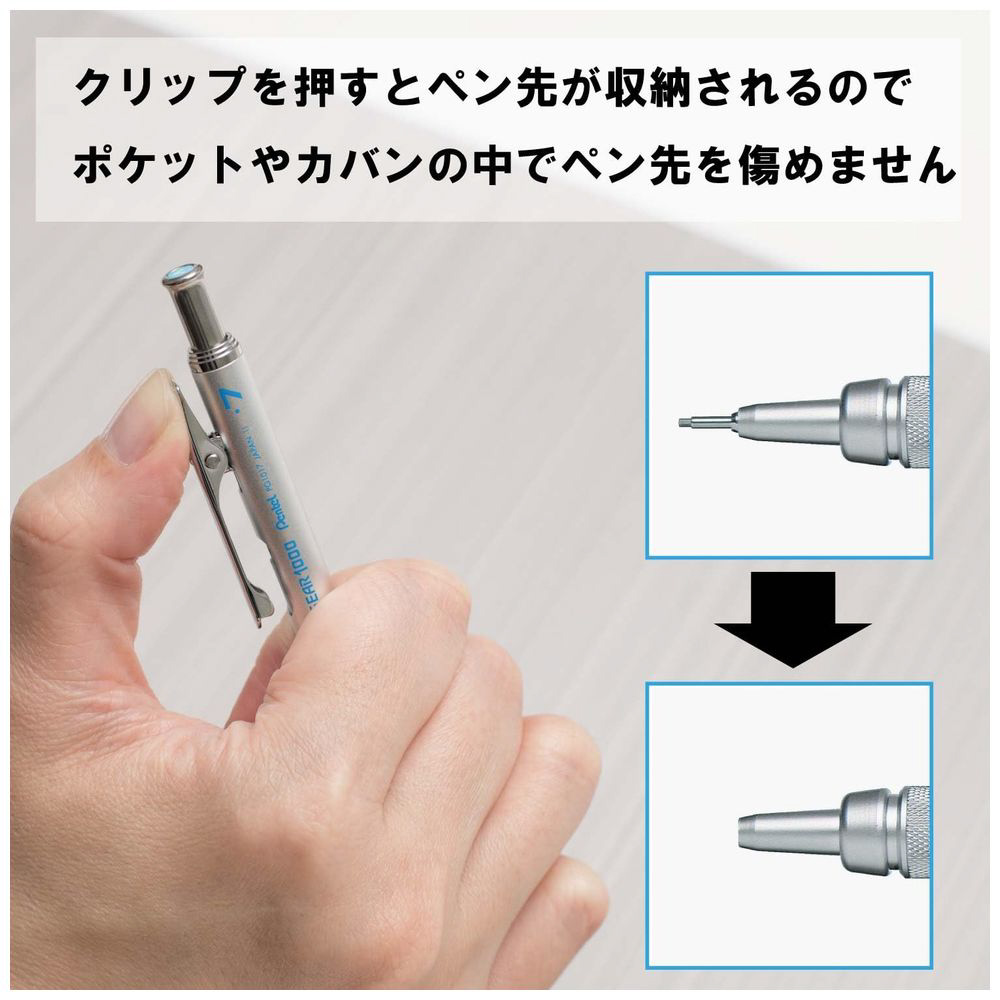 先端部分を収納できる安心設計。グリップ部はゴムグリップとローレット加工を施した新考案のデュアルグリップ採用。クリップは筆記時は先端がボディに半収納される新設計。