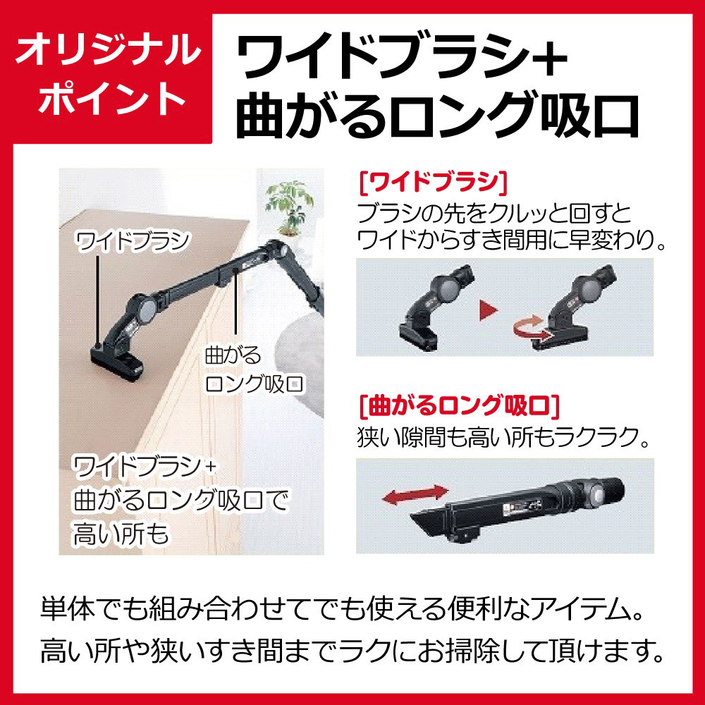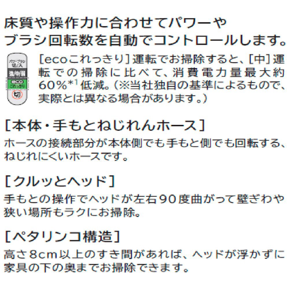 ■小型・軽量・ハイパワー デザインを一新し、ボディをスリム化。モーター素材に軽いアルミを使用するなど、軽量化を実現。高性能ファンモーターと空気流路のスムーズ化により強烈パワーを実現しました。■[ワイドブラシ]+[曲がるロング吸口] 単体でも組み合わせてでも使える便利なアイテム。高い所や狭いすき間までラクにお掃除して頂けます。■[ecoこれっきり]運転床質や操作力に合わせてパワーやブラシ回転数を自動コントロール。