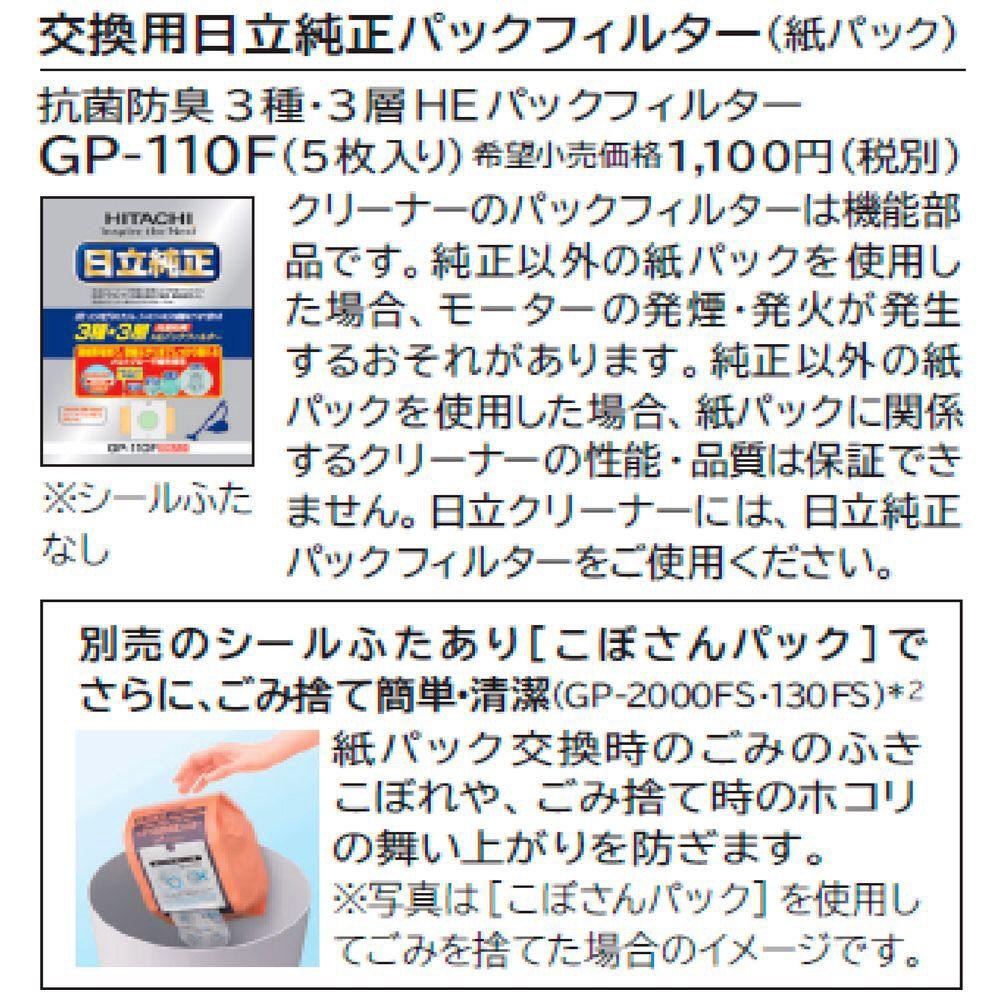 | 対応紙パック | 抗菌防臭3種・3層HEパックフィルター(5枚入):GP-110F、ナノテク高捕じんプレミアム衛生フィルターパック(3枚入):GP-2000FS、ナノテクプレミアム衛生フィルターこぼさんパック(3枚入):GP-130FS、抗菌防臭3層クリーンパックフィルター(5枚入):GP-75F |