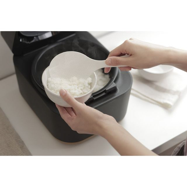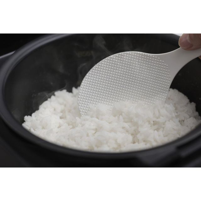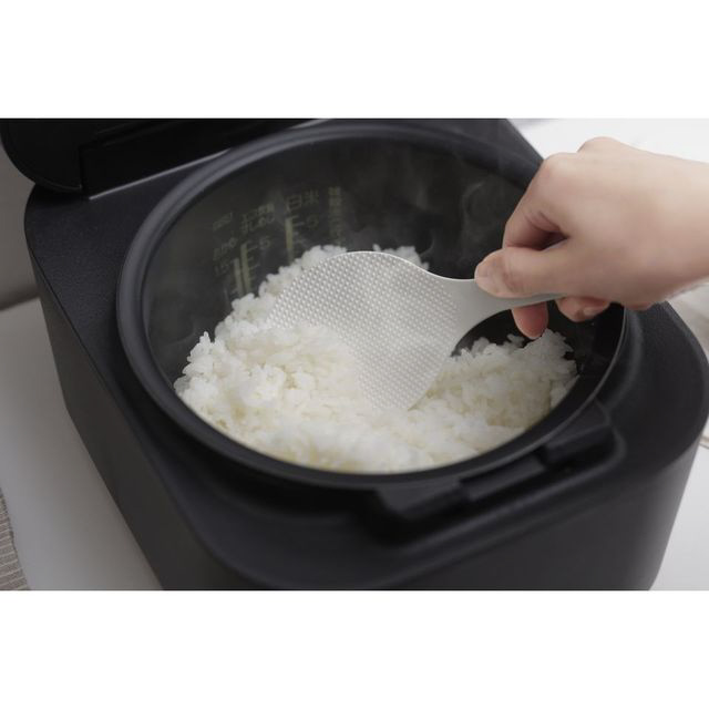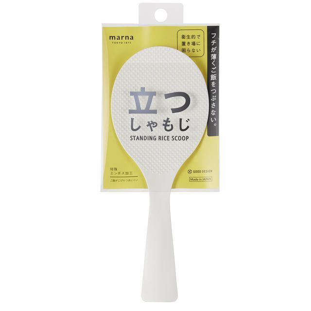 ヘラ部分が薄く、特殊エンボス加工を施しているので、お米が潰れず、くっつきにくくなっています。また自立できるデザインで衛生面でも安心です。