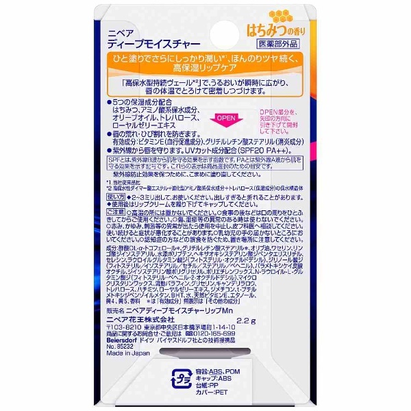【NIVEA(ニベア)】 ディープモイスチャーリップ はちみつの香り 2.2g〔リップクリーム〕