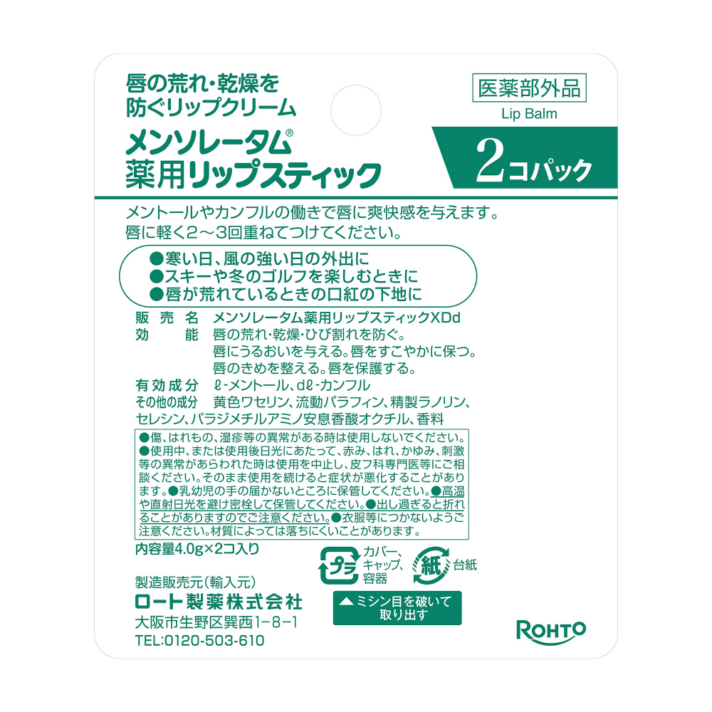 唇の表面をおおって風や寒さから唇を守り、荒れ・乾燥を防ぎます。またメントールやカンフルの働きで、唇に爽快感を与えるのが特長です。