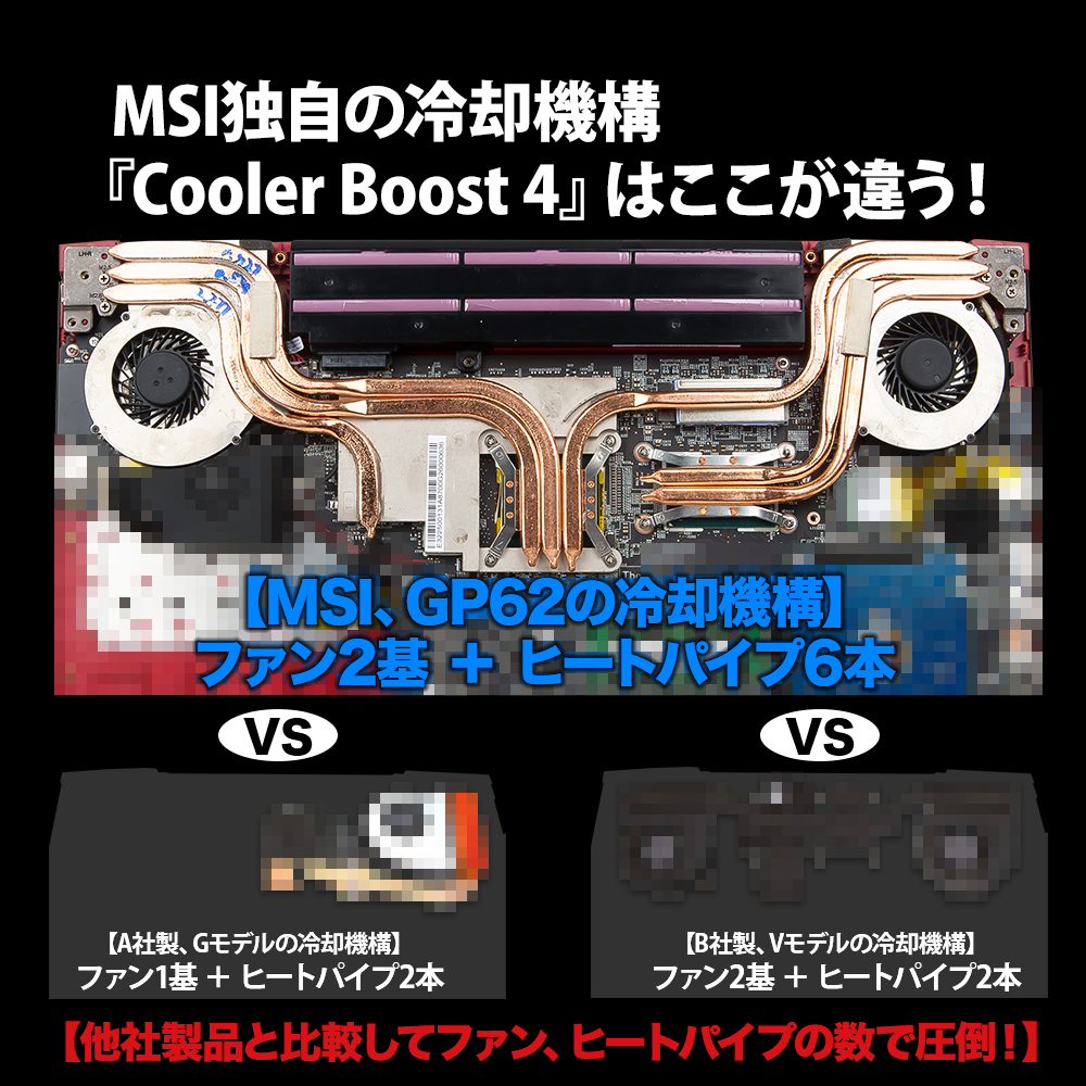 GP72 7REX-637JPではCPUとGPUの性能を最大限発揮するため、「Cooler Boost 4」を搭載。2基のファンと合計6本のヒートパイプがCPUとGPUから発生する熱を効率的に外部へ排出し、熱問題を気にすることなくゲームをお楽しみいただくことができます。