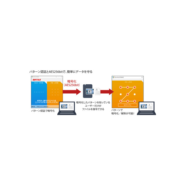 従来のパスワードによる暗号化に加え、直感的に、すばやく操作できるパターン認証を採用しパターンで暗号化/解除が可能な最新セキュリティーソフトウェア「SecureLock Mobile(セキュアロックモバイル)2」。Windowsタブレットでも使いやすいUIで簡単・安心にデータを暗号化することができます。暗号化方式には「AES256bit」を採用。